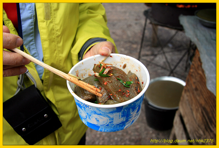 우리나라 도토리묵처럼 생긴 것을 팬에 구워 양념장을 얹어 판다.