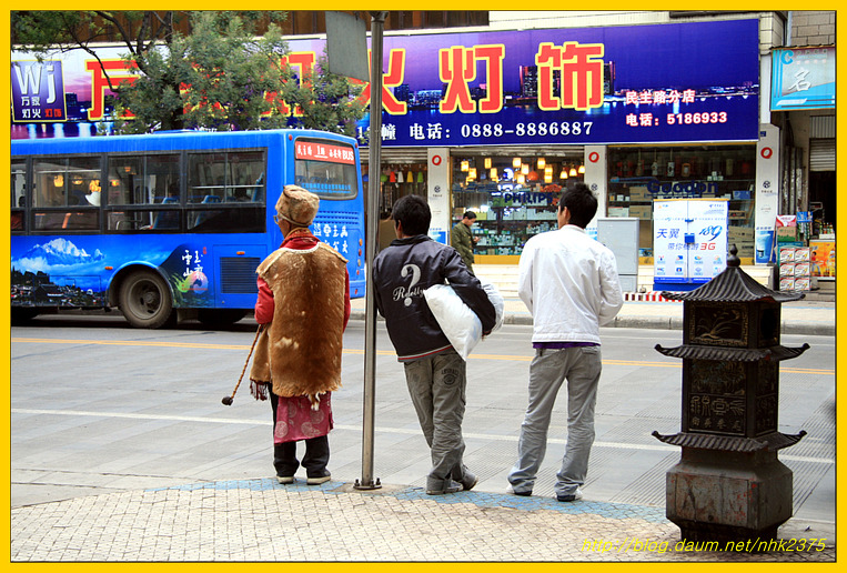버스를 기다리는 나시족 할배의 마방 스타일과 젊은 세대의 모습.