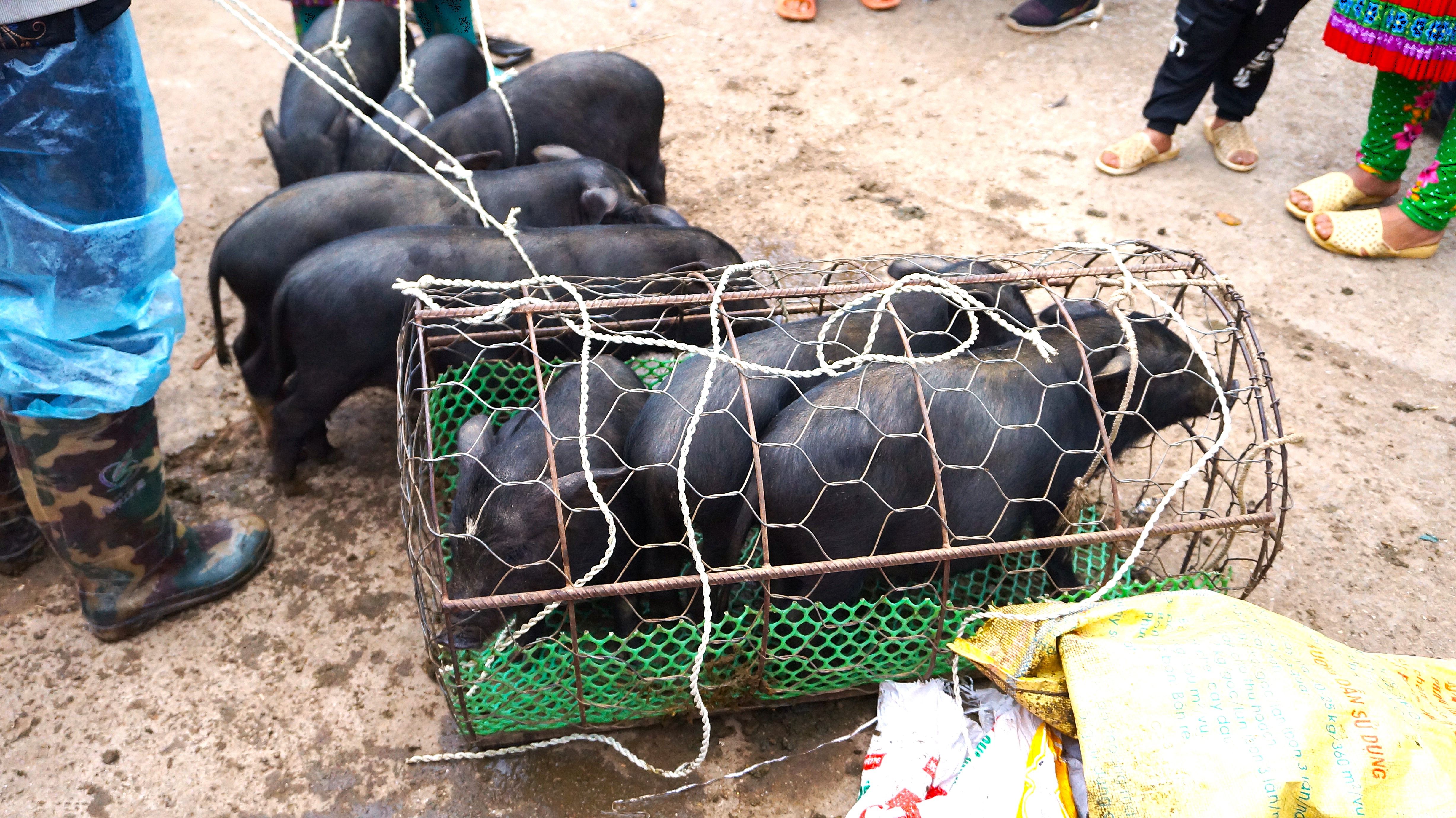 이렇게 시끌벅쩍한 장터에서 기다리다 새 주인에게 선택받은 녀석은 돼지운반 전용 망