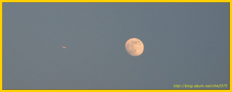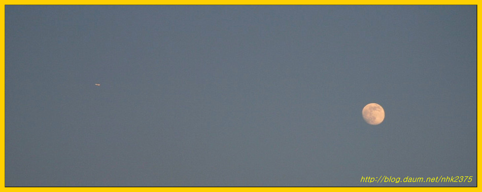하늘을 보니 보름달이 보이고 그 옆으로 비행기가 지나갑니다.