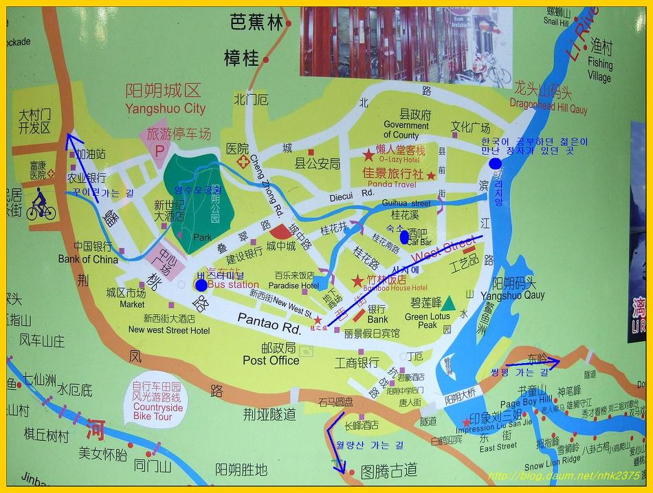 오른쪽에 리지앙이라는 강의 북쪽이 씽핑이며 더 올라가면 구이린입니다.