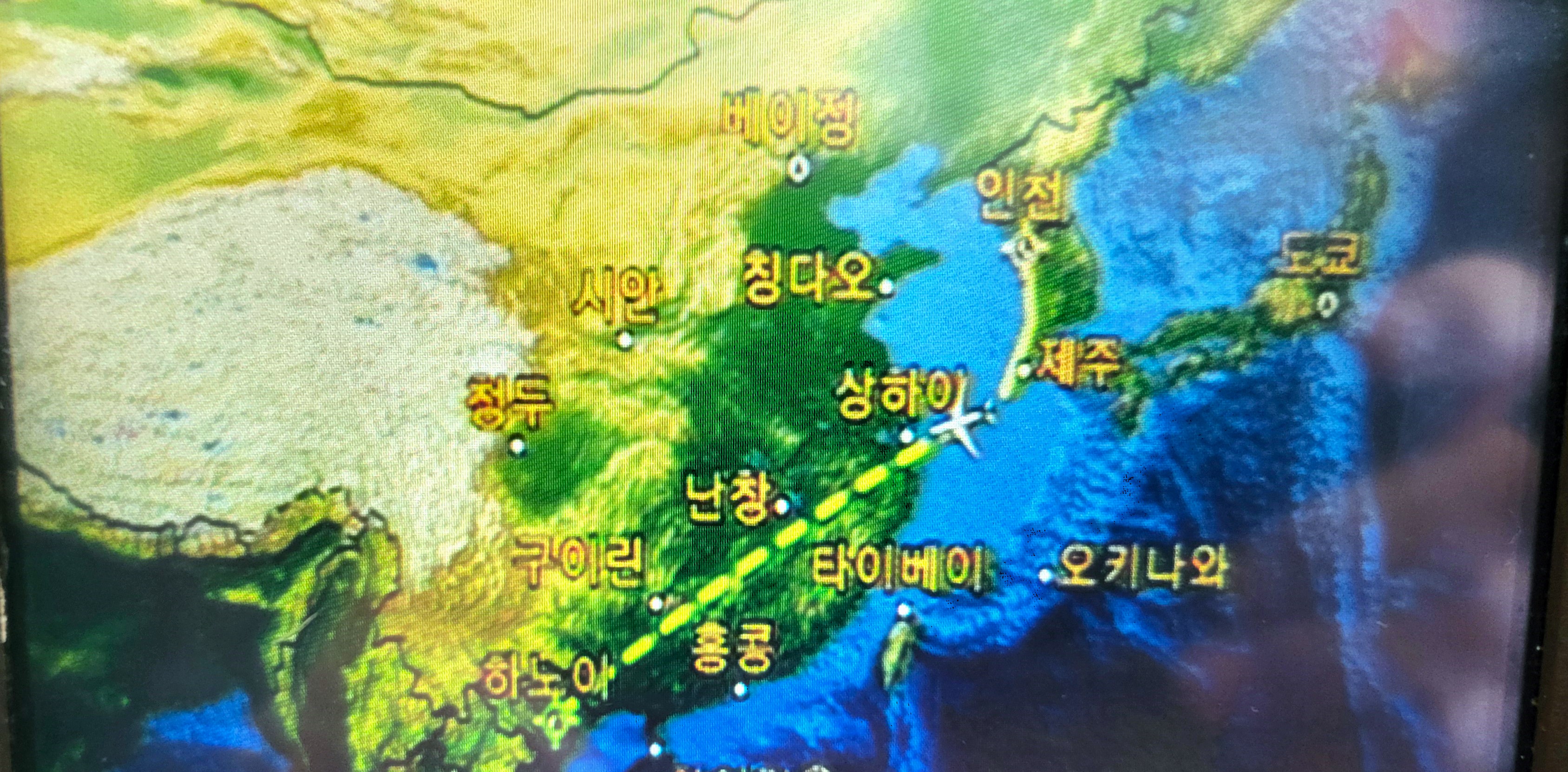 서쪽으로 방향을 틀어 상하이를 지나 중국 남부지방을 관통해 비행하네요.