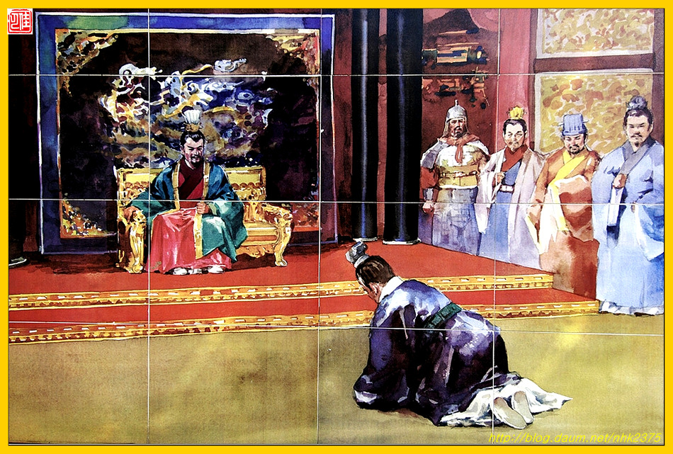바로 위의 사진이 헌제가 조비에 엎드려 제발 보위를 받아달라고 애원하는 그림입니다.