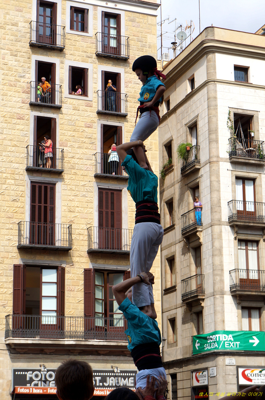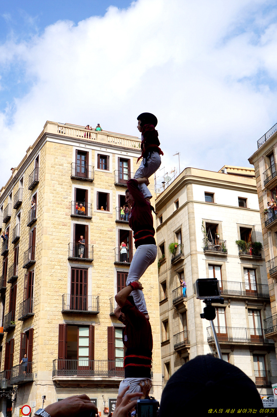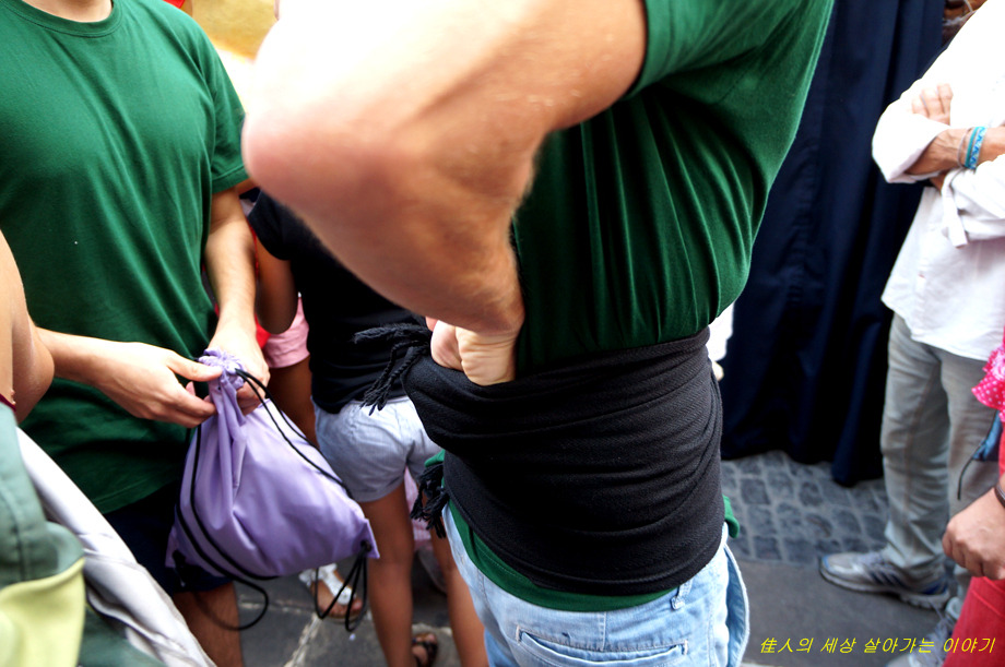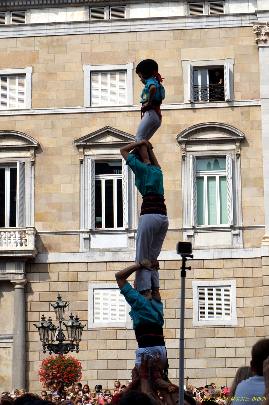 4단의 인간 탑을 쌓아 그냥 서 있기도 어려울 텐데. 이런 상태로 광장을 가로질러 들어갑니다.