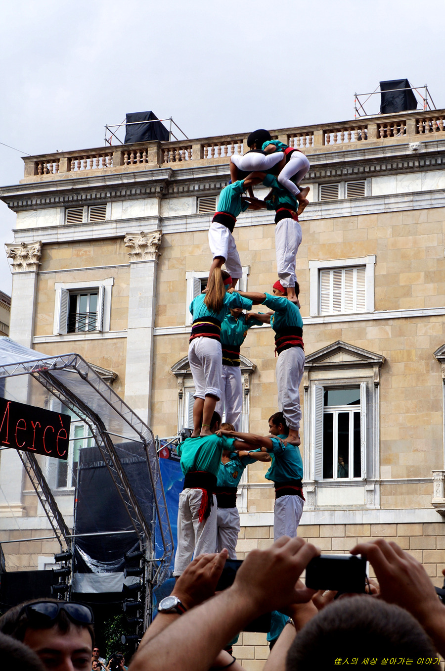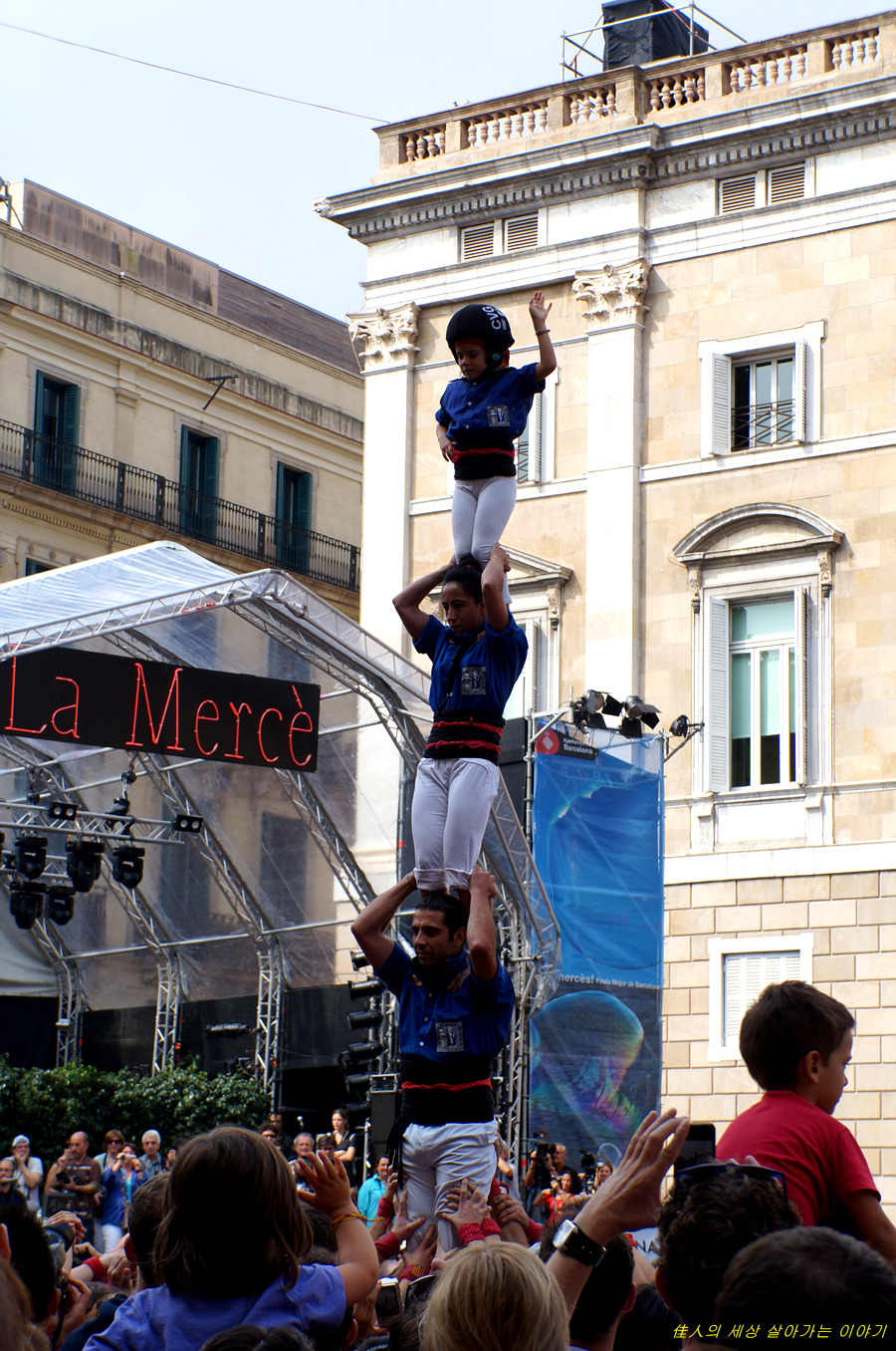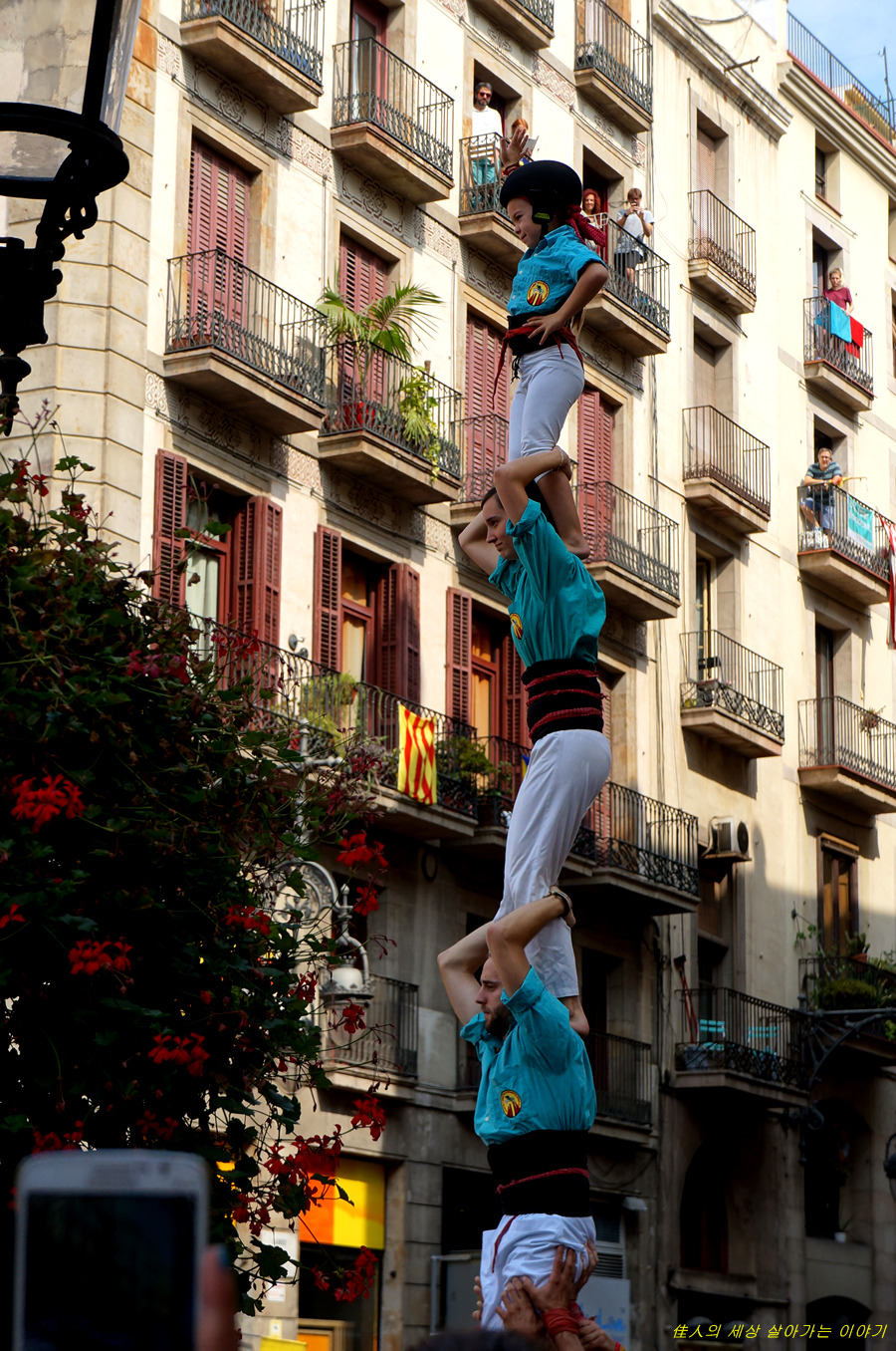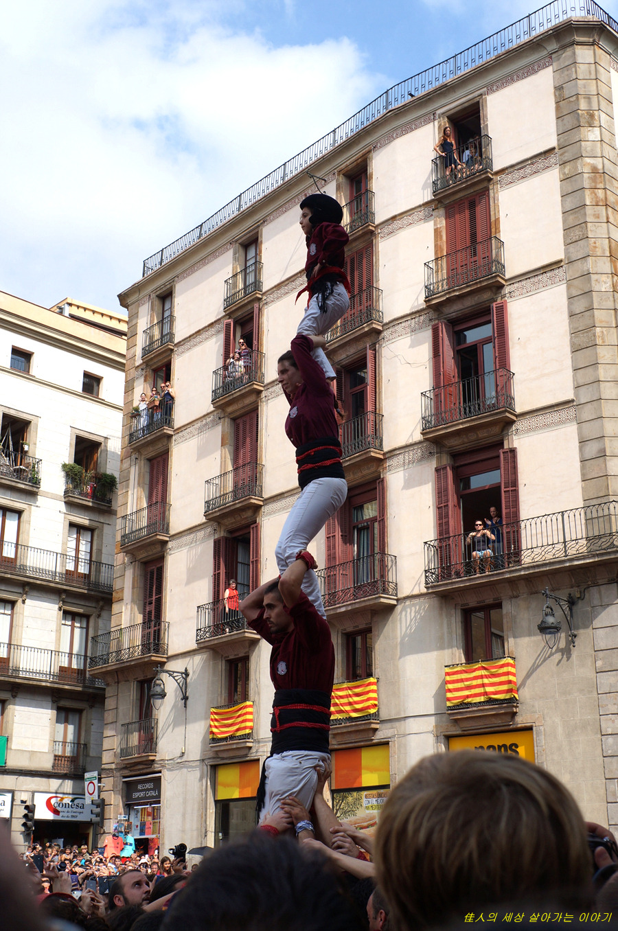 4단의 인간 탑을 쌓아 그냥 서 있기도 어려울 텐데. 이런 상태로 광장을 가로질러 들어갑니다.