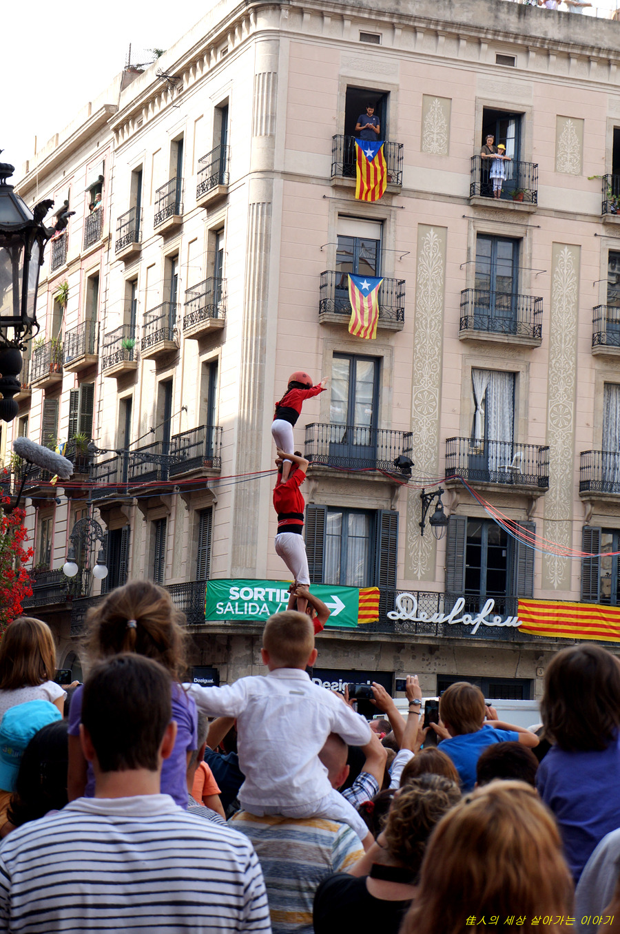 대형 카탈루냐 국기가 위의 사진처럼 옥상에서부터 주르륵 내려오며 활짝 펴지기 시작합니다.