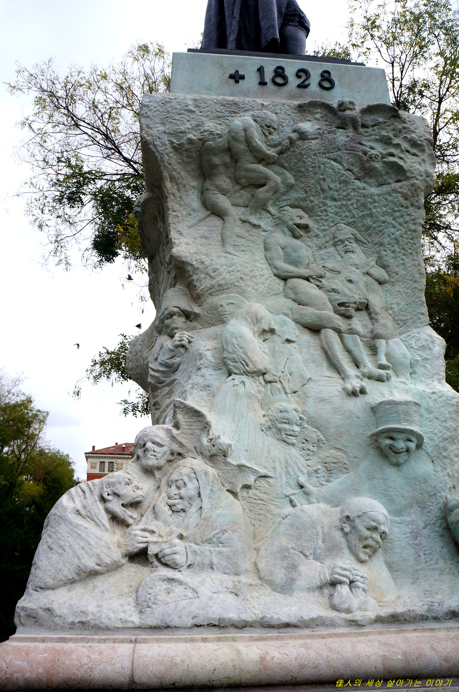 앞에 세운 동상에는 아래에 그의 작품 중 유명한 작품을 돌에 새겨놓았습니다.