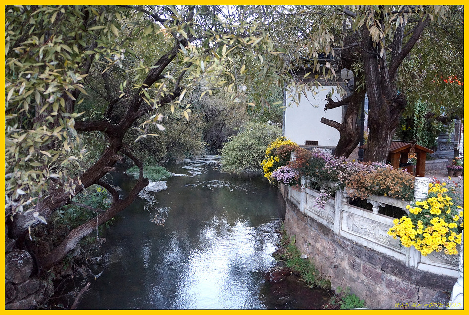 물가로 수양 버들이 낭창하게 자라고 그것도 부족해 수로 양쪽으로 국화꽃도 피었습니다.