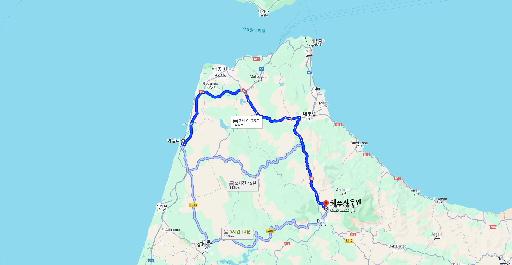 쉐프샤우엔을 떠나 아실라로 가는 길을 구글 지도를 통해 살펴보니 거리는 약 150km이고