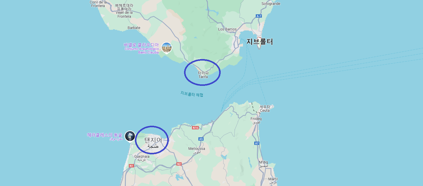 그러나 북아프리카 땅과 유럽 땅인 이베리아 반도 타리파 사이에 지브롤터 해협을 건너는