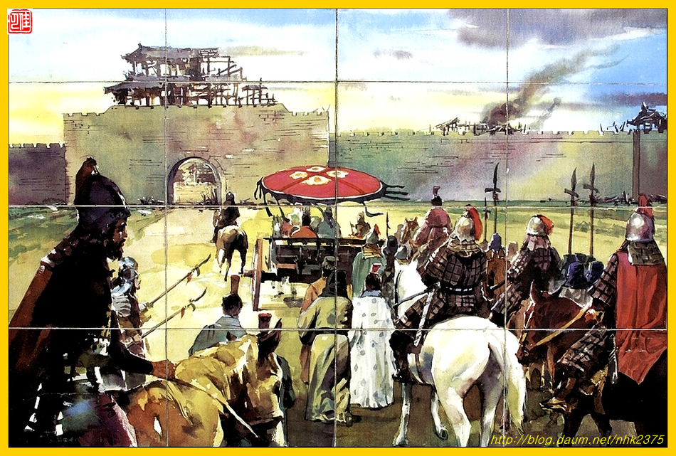 위의 사진에 보이는 장면은 근무에 너무 충실히 하려고 통금을 위반한 권력자 환관의 친척을