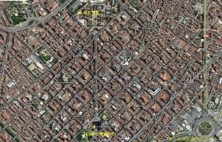 위의 지도에 보시면 산 파우 병원은 사그라다 파밀리아의 정북 쪽 방향입니다.