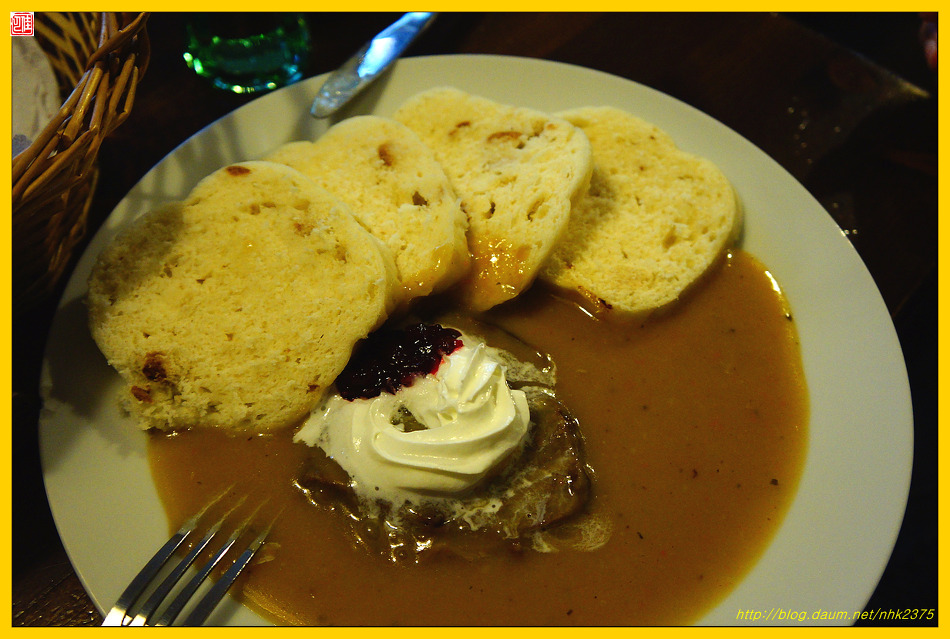 오늘 점심은 프라하 사람이 즐겨 먹는다는 스비치코바라는 음식입니다.
