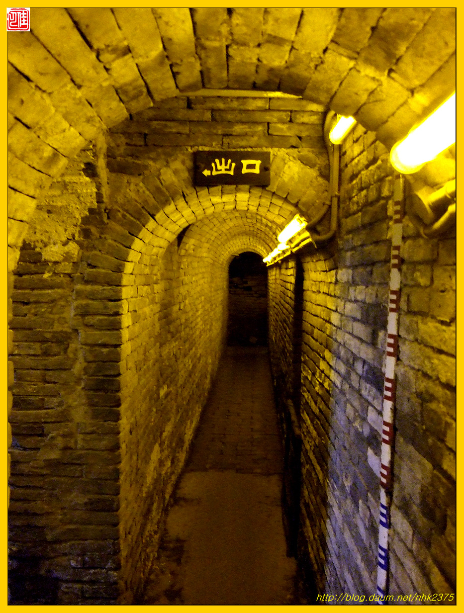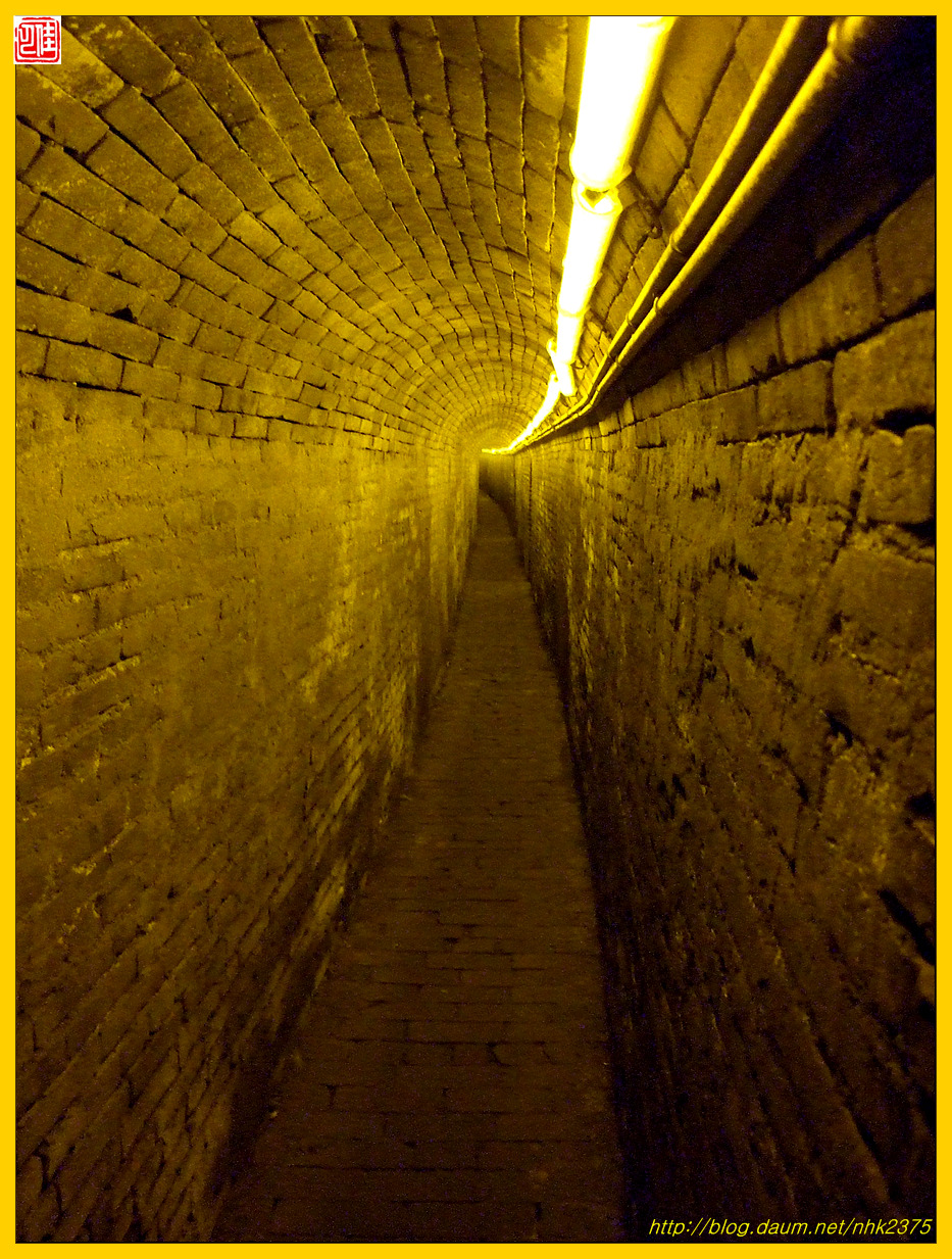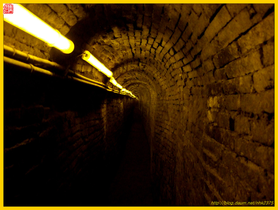 한 사람이 몸을 도사리며 빠져나갈 정도인 좁은 지하도에 무슨 시설을 한 듯합니다.