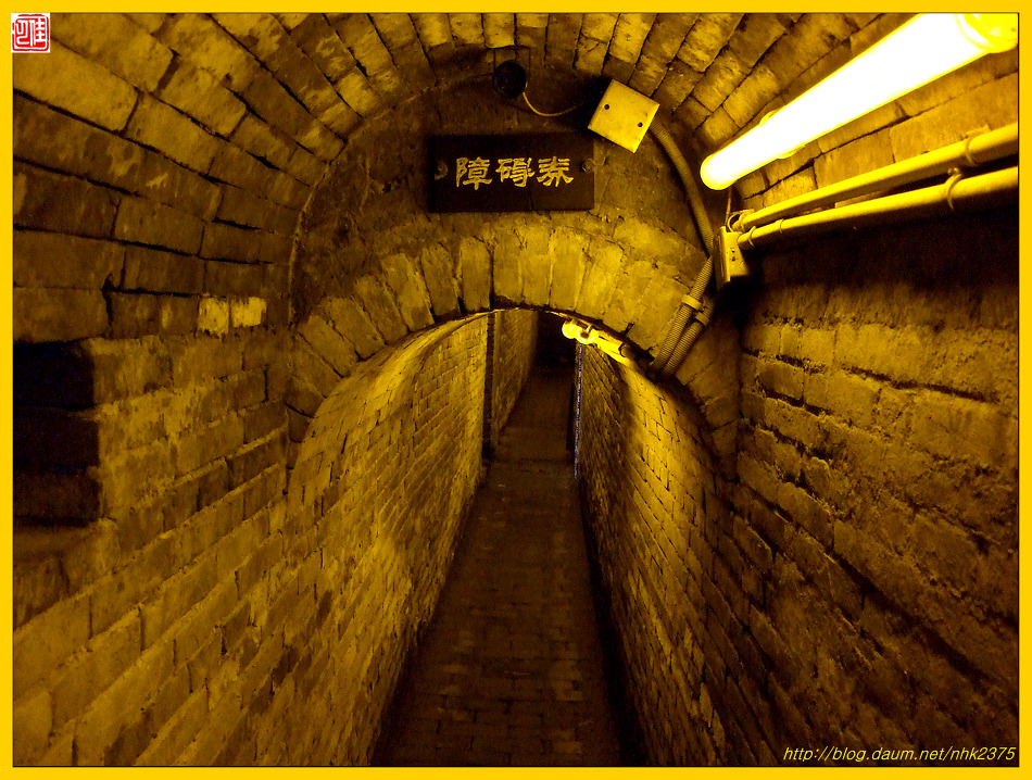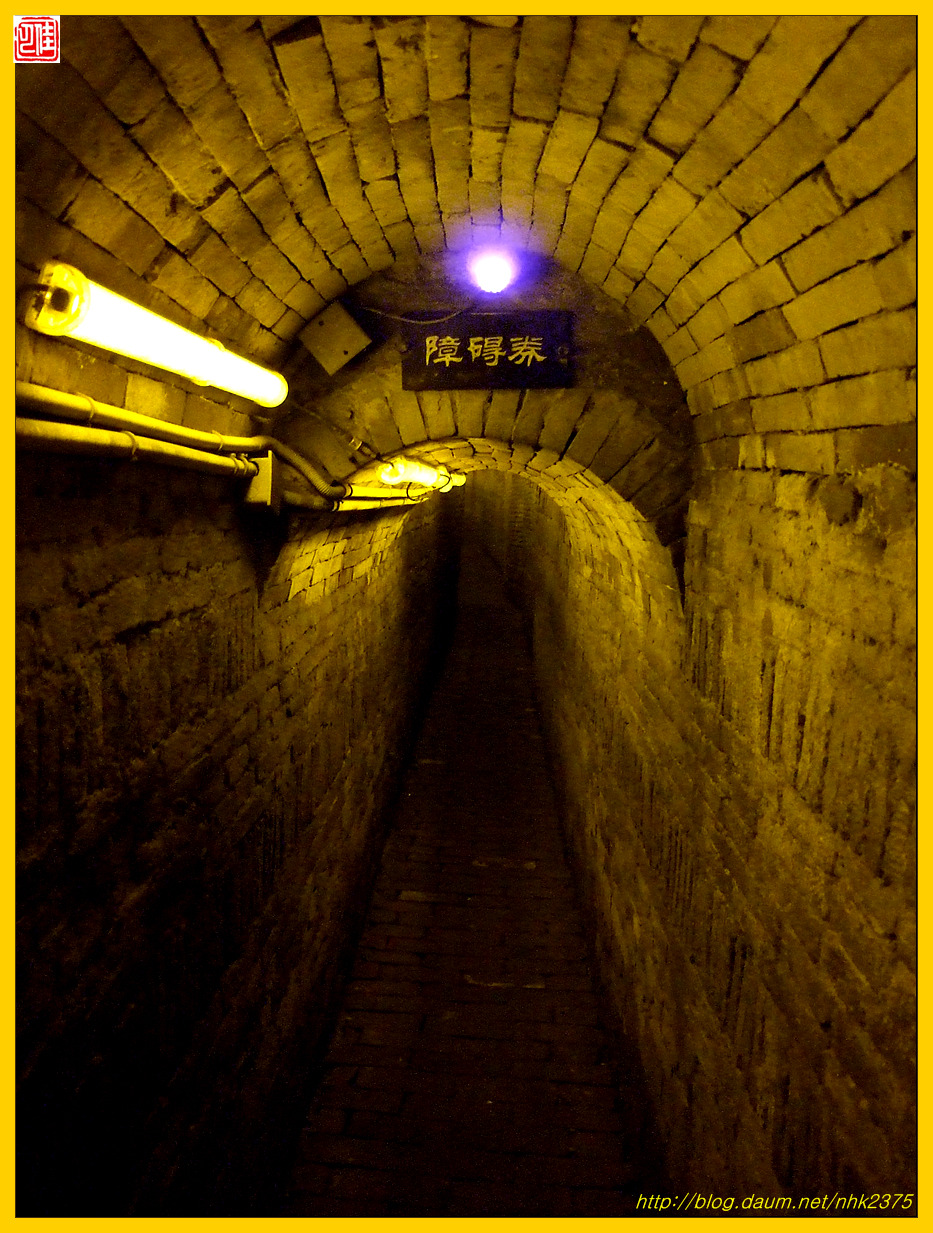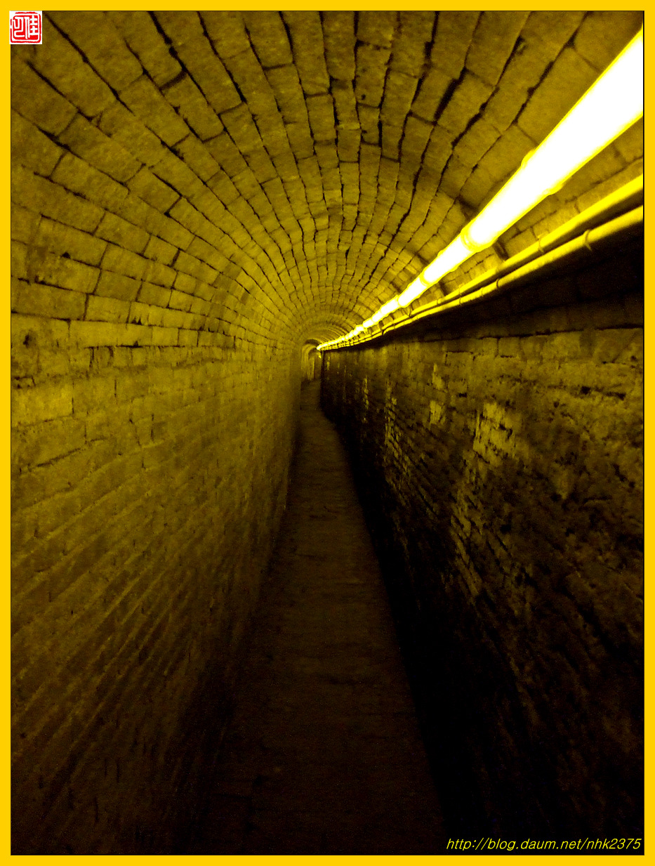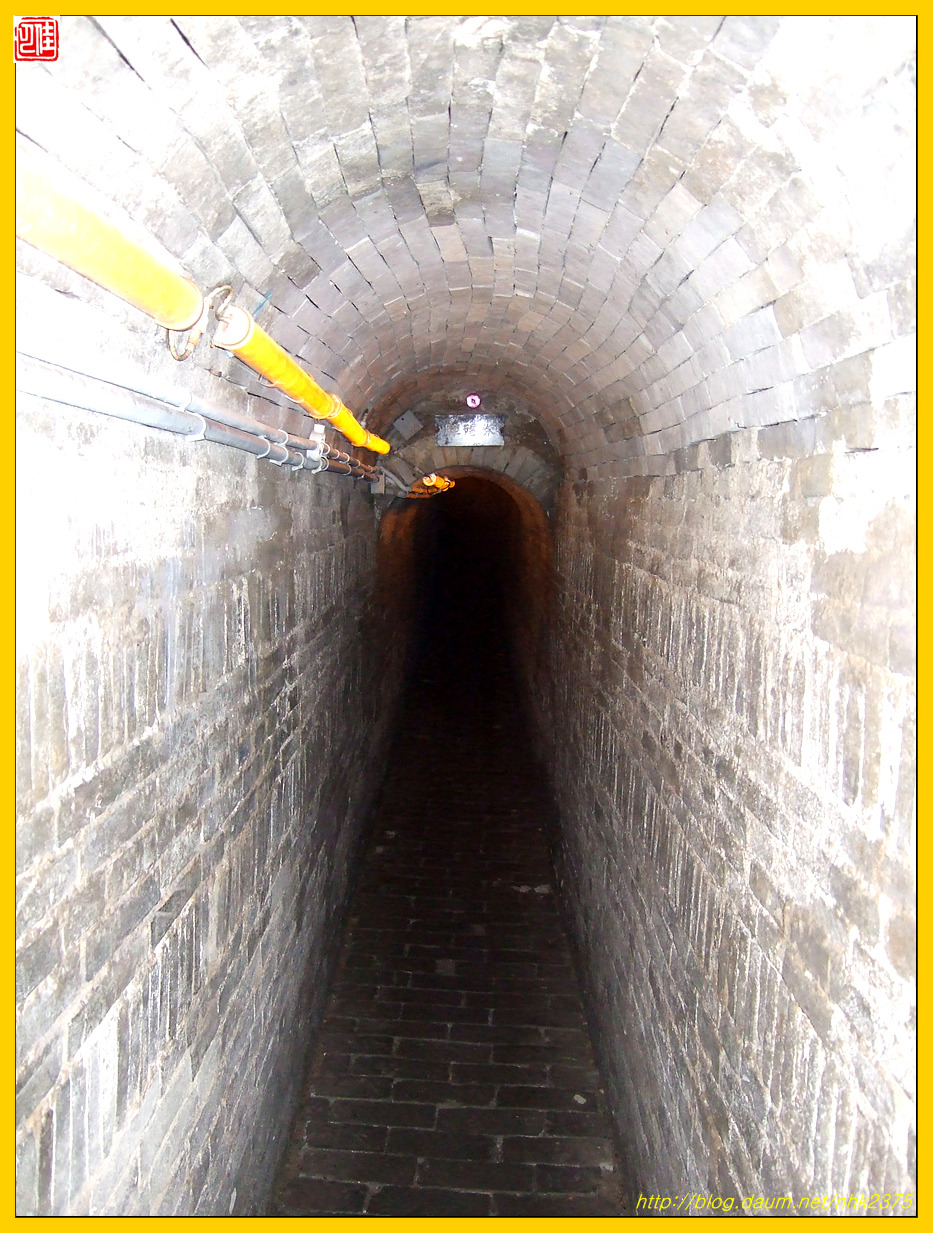 한 사람이 몸을 도사리며 빠져나갈 정도인 좁은 지하도에 무슨 시설을 한 듯합니다.