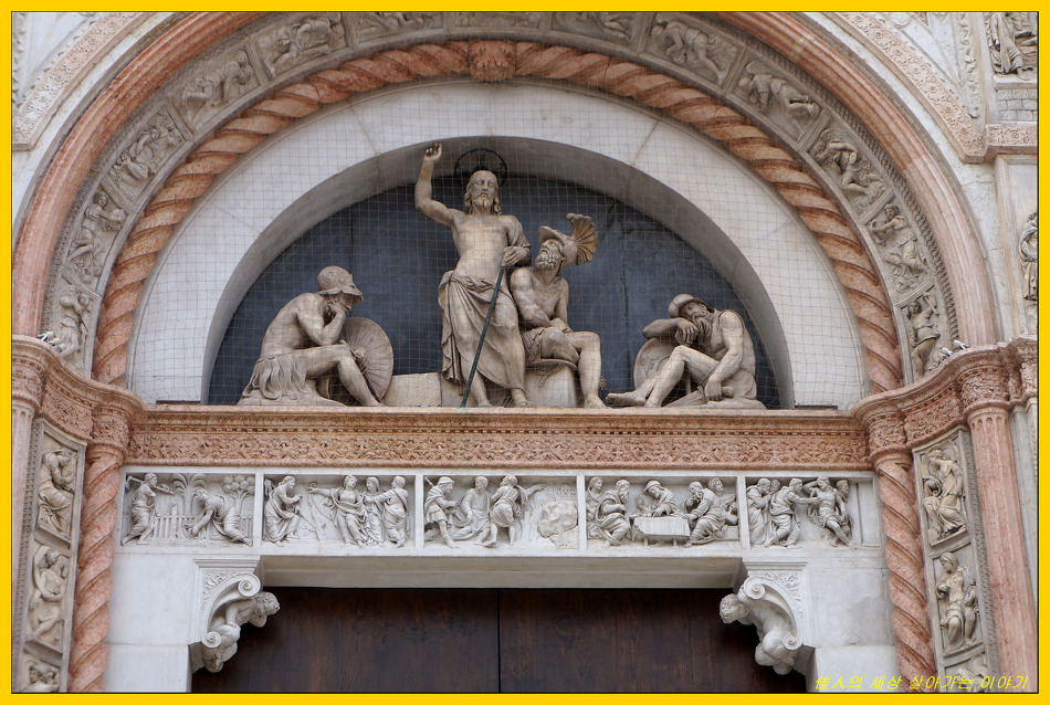 위의 사진 출입문 왼쪽의 조각은 에덴동산에서 이브의 추방을 그린 듯합니다.