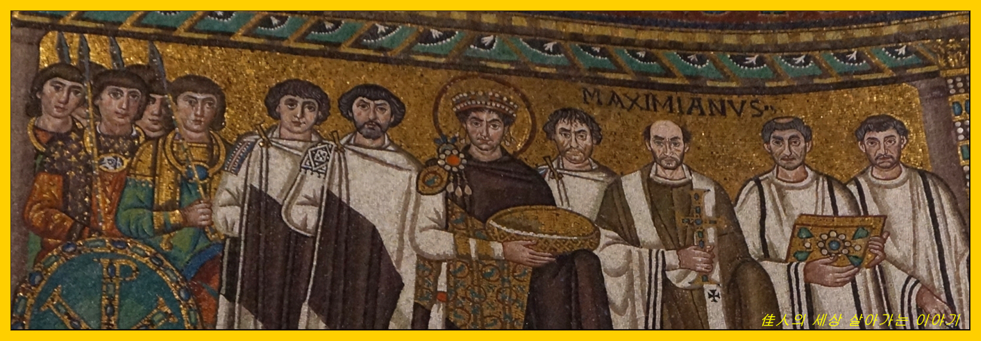 대주교 막시미아누스는 유스티아누스가 신하를 거느린 모자이크에 위의 사진에 보듯