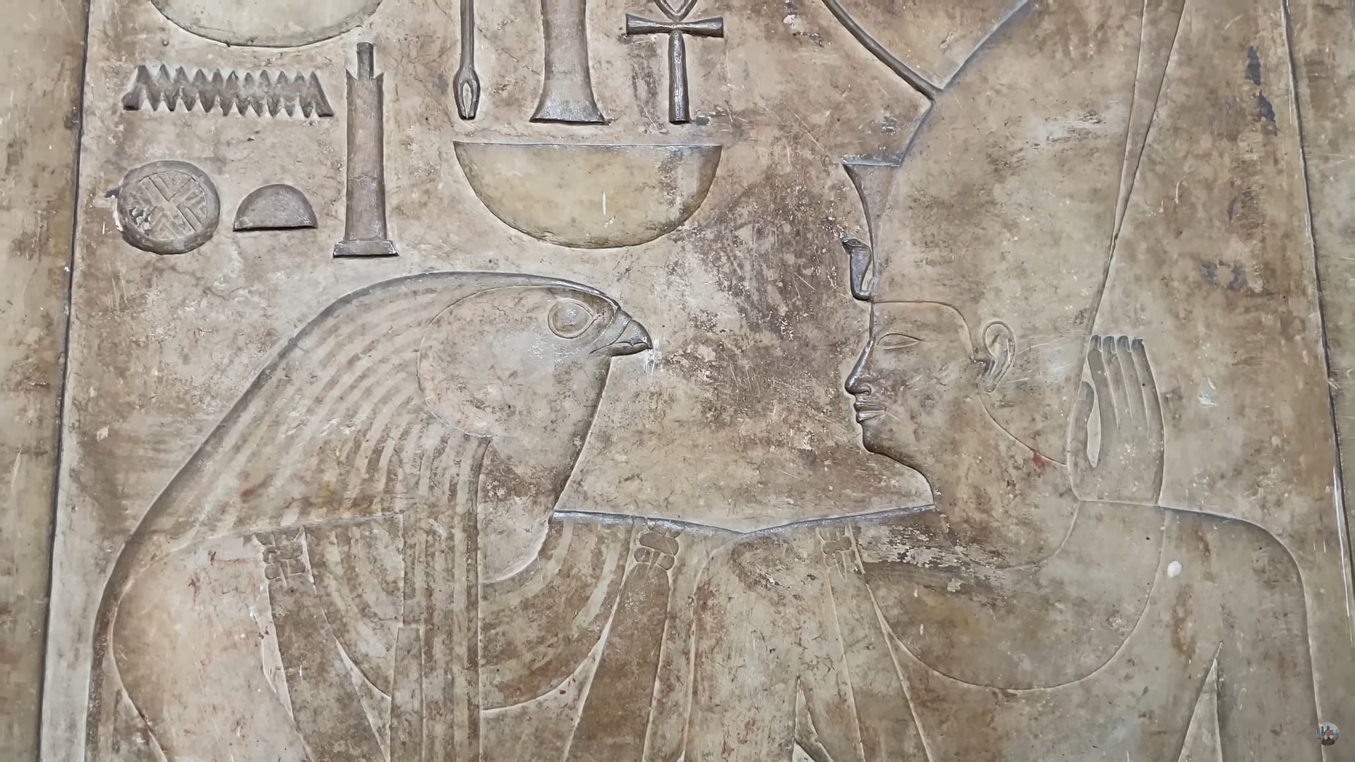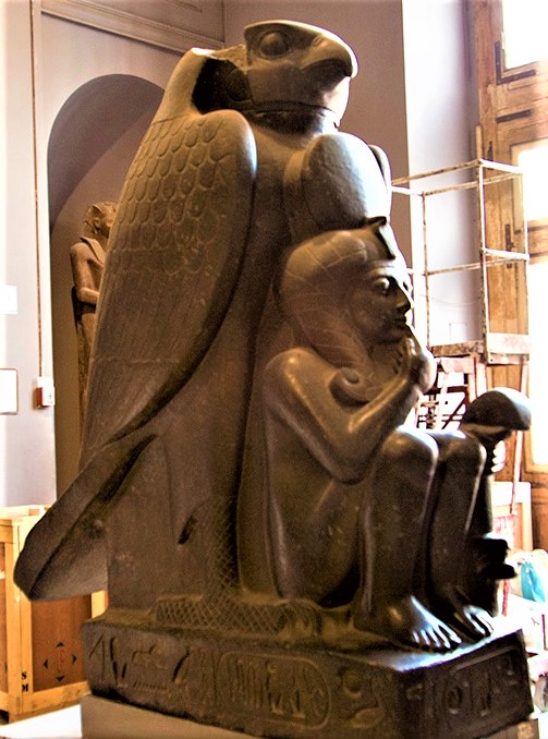 위의 사진은 매 형상의 호루스 신으로부터 보호받는 람세스 2세의 어린 모습입니다.