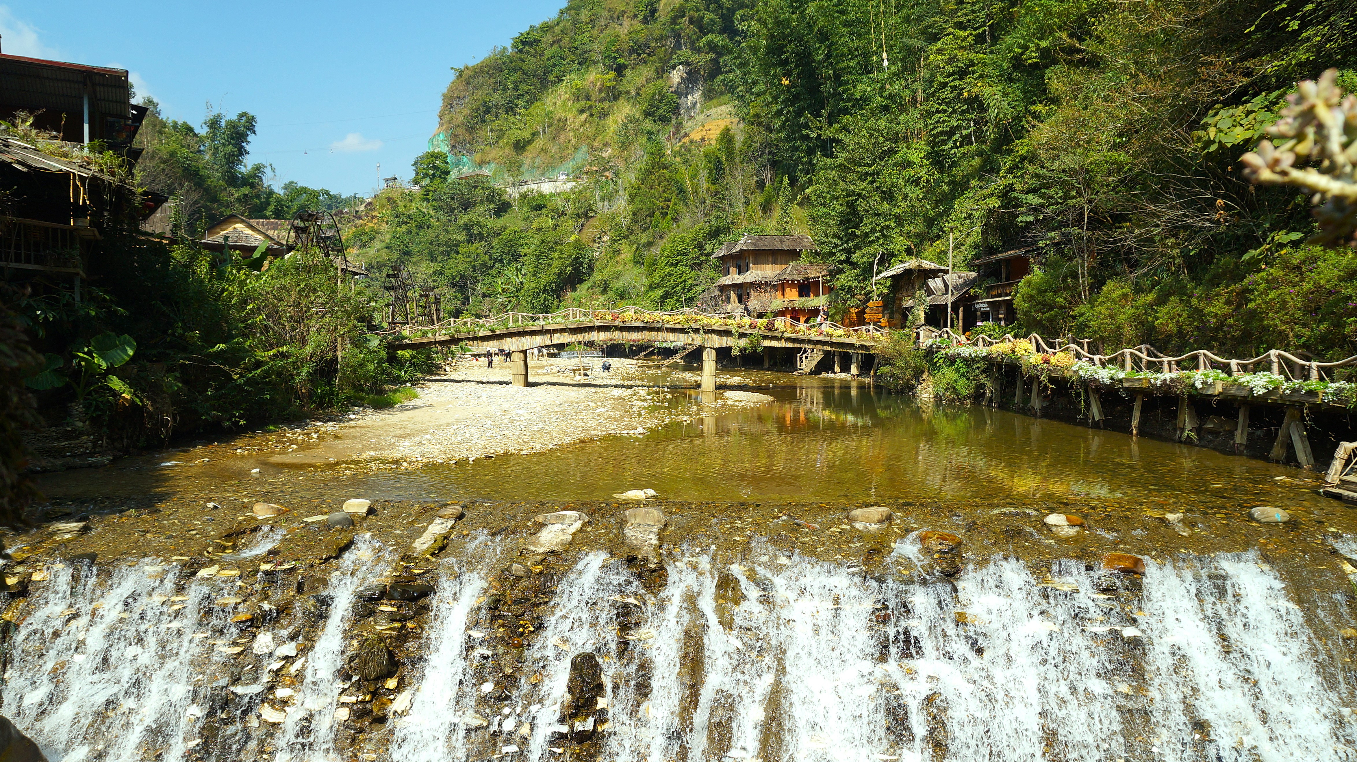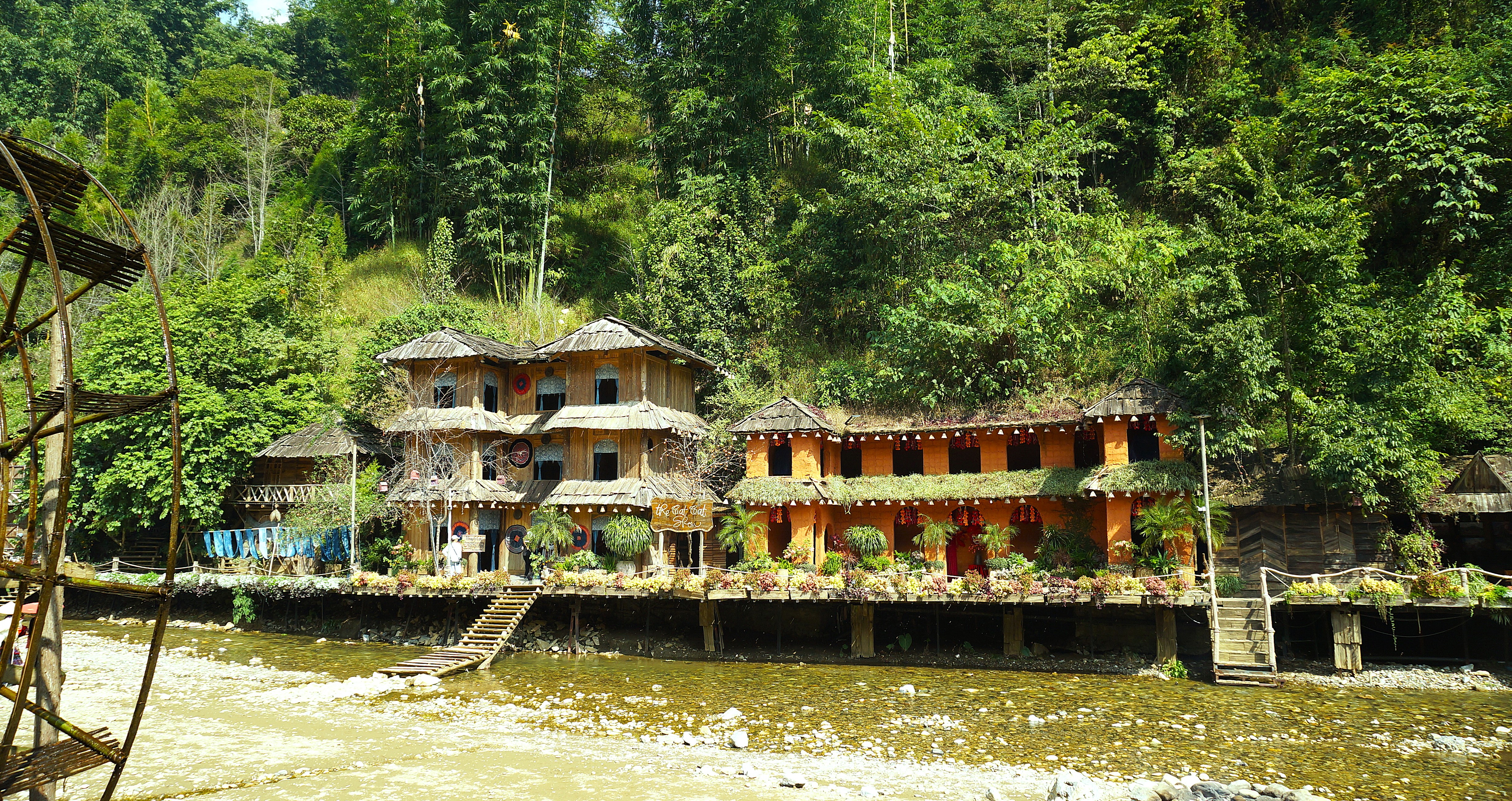 개울 건너편으로 흐몽족이 살았을 듯한 나무로 지은 집이 보입니다.
