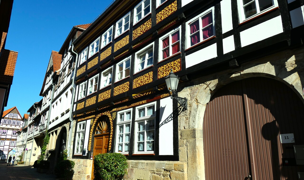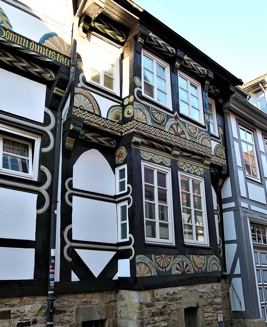 일종의 하프팀버 양식의 독일 전통가옥의 이 양식은 대들보에 문자와 물레방아 문양으로