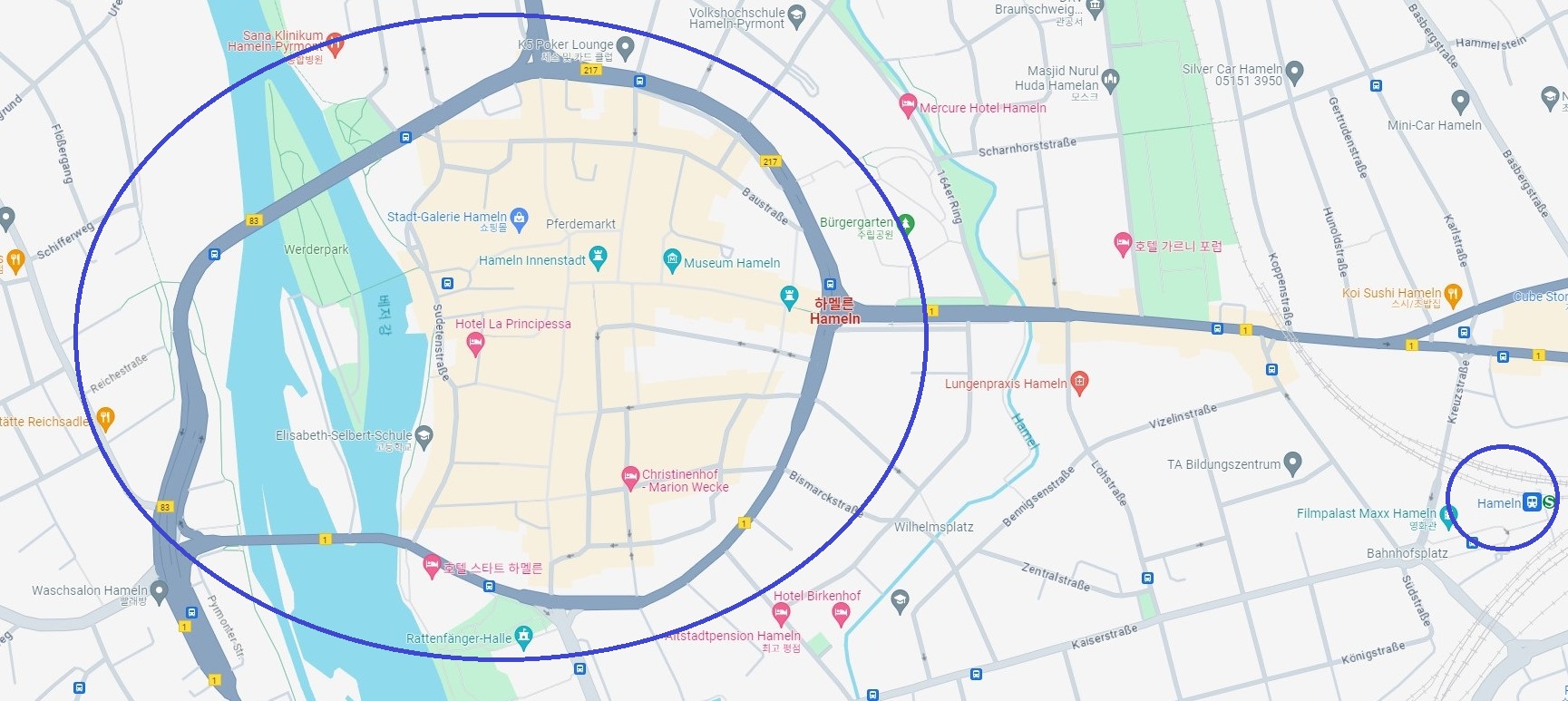 위의 지도를 보면 오른쪽 작은 원 안에 기차역이 있고 왼쪽 큰 원이 구시가지로