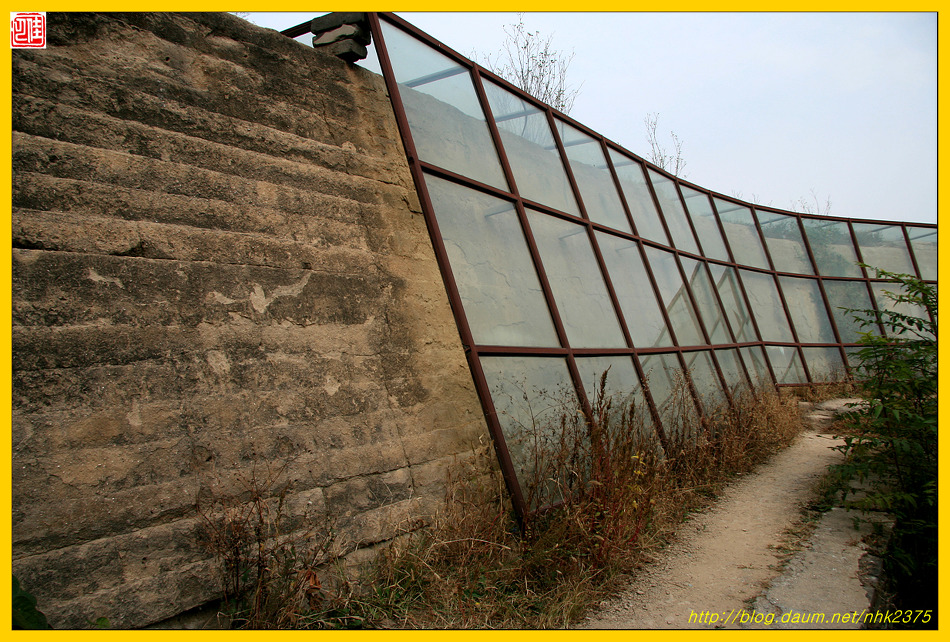 옛날에 쌓았던 진흙 담장이 비바람에 사라지지 않게 유리로 덮었습니다.