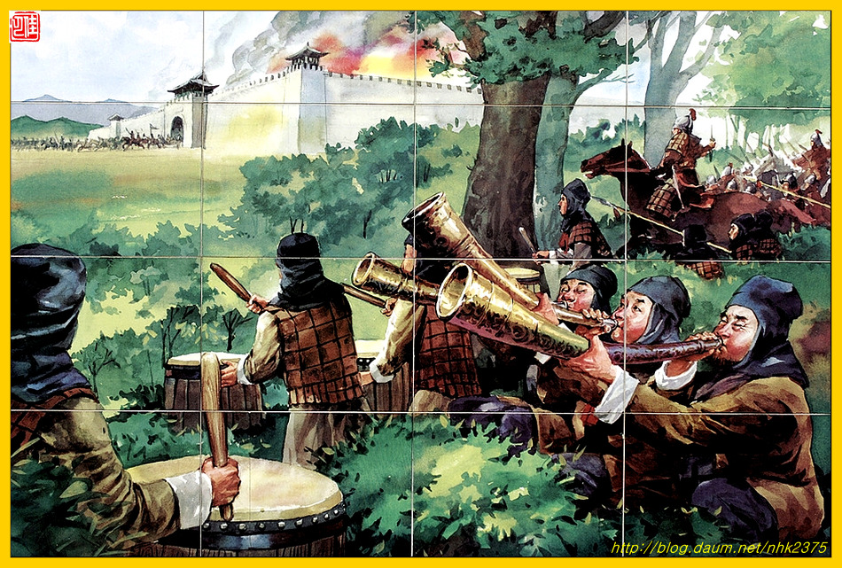 군사가 내지르는 함성, 말들이 내달리며 내는 말발굽 소리, 창칼 부딪히는 소리...