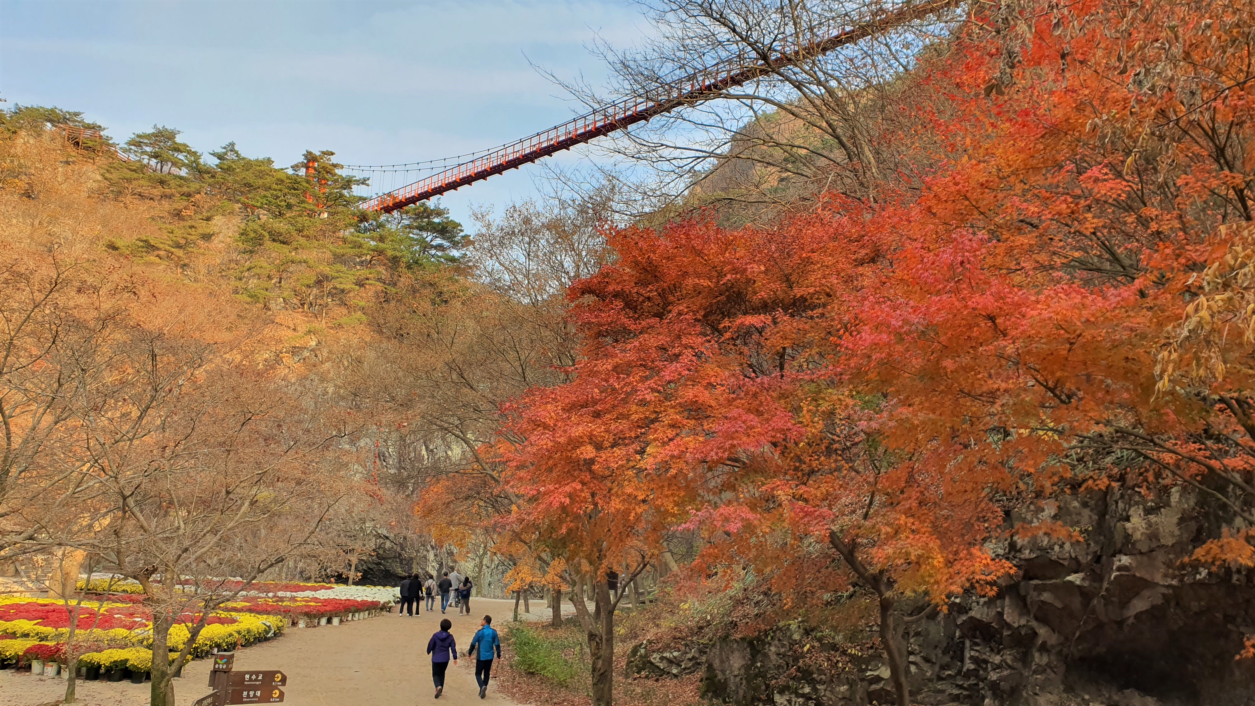 지금 위의 사진에서 보듯이 절벽의 계곡 사이를 잇는 현수교(구름다리)가 보입니다.