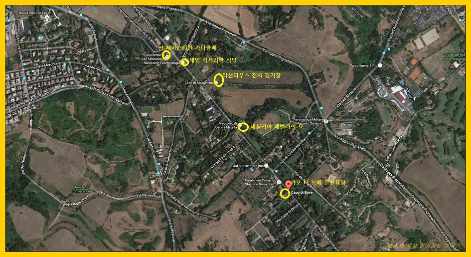 위의 지도는 오늘 아피아 가도를 걸으며 보았던 곳을 표기해 보았습니다.