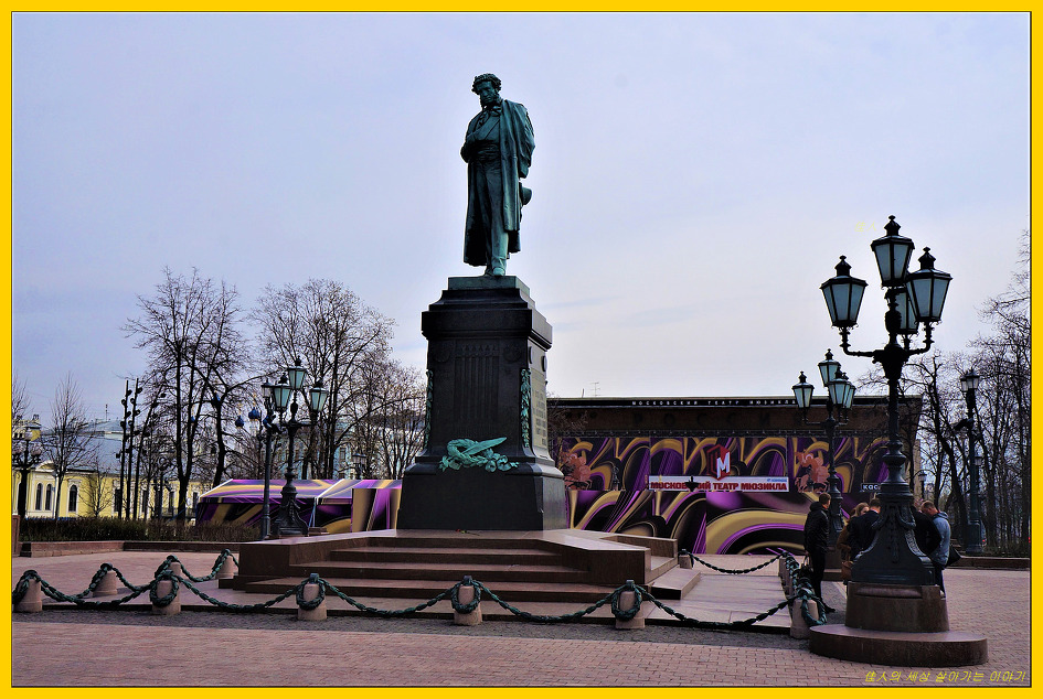 푸시킨 조각상 뒤로 보이는 건물은 모스크바 뮤지컬 극장(Moskovskiy Teatr Myuzikla)이라고