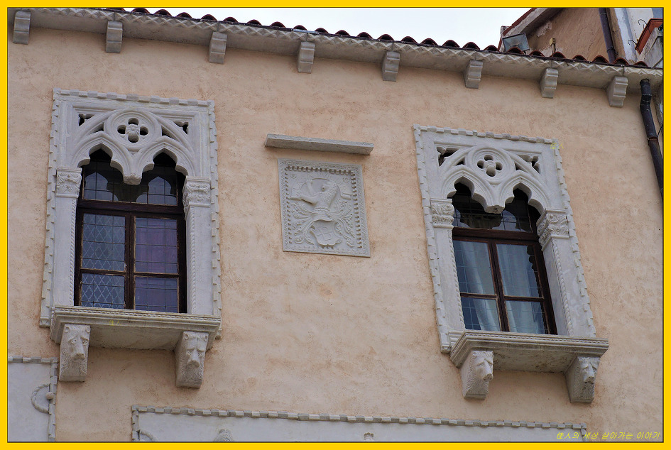 광장 한쪽에 보이는 건물의 창틀이 아름답습니다.