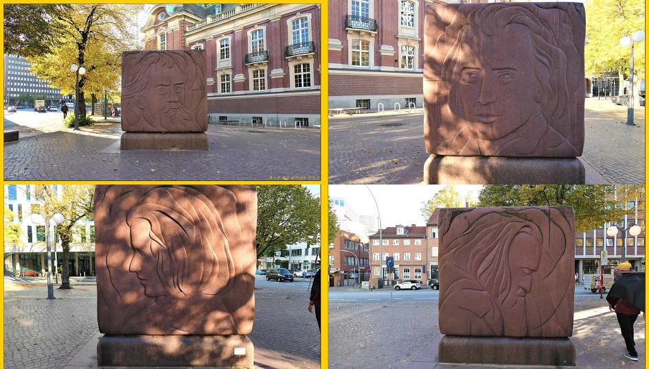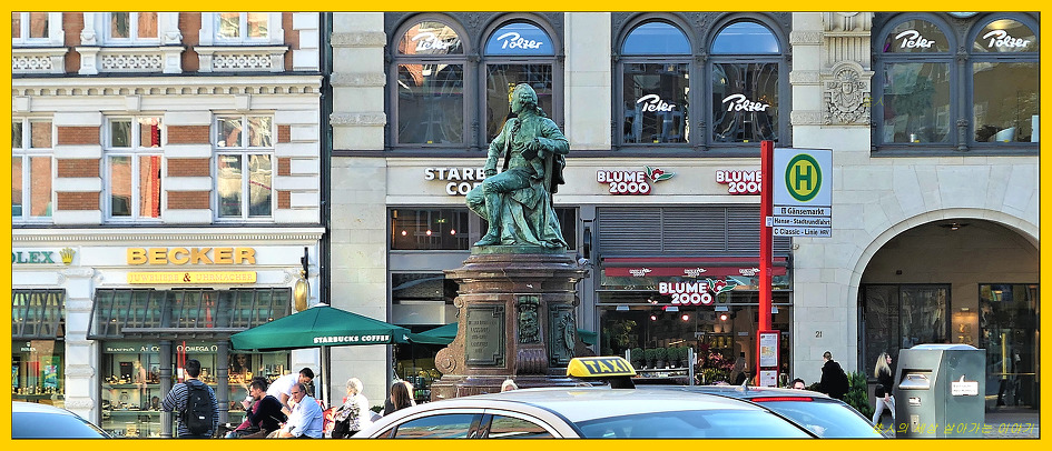 왼손에 책을 들고 앉아있는 모습이고 간세 마르크트 광장(Gänsemarkt)은 그가 한때