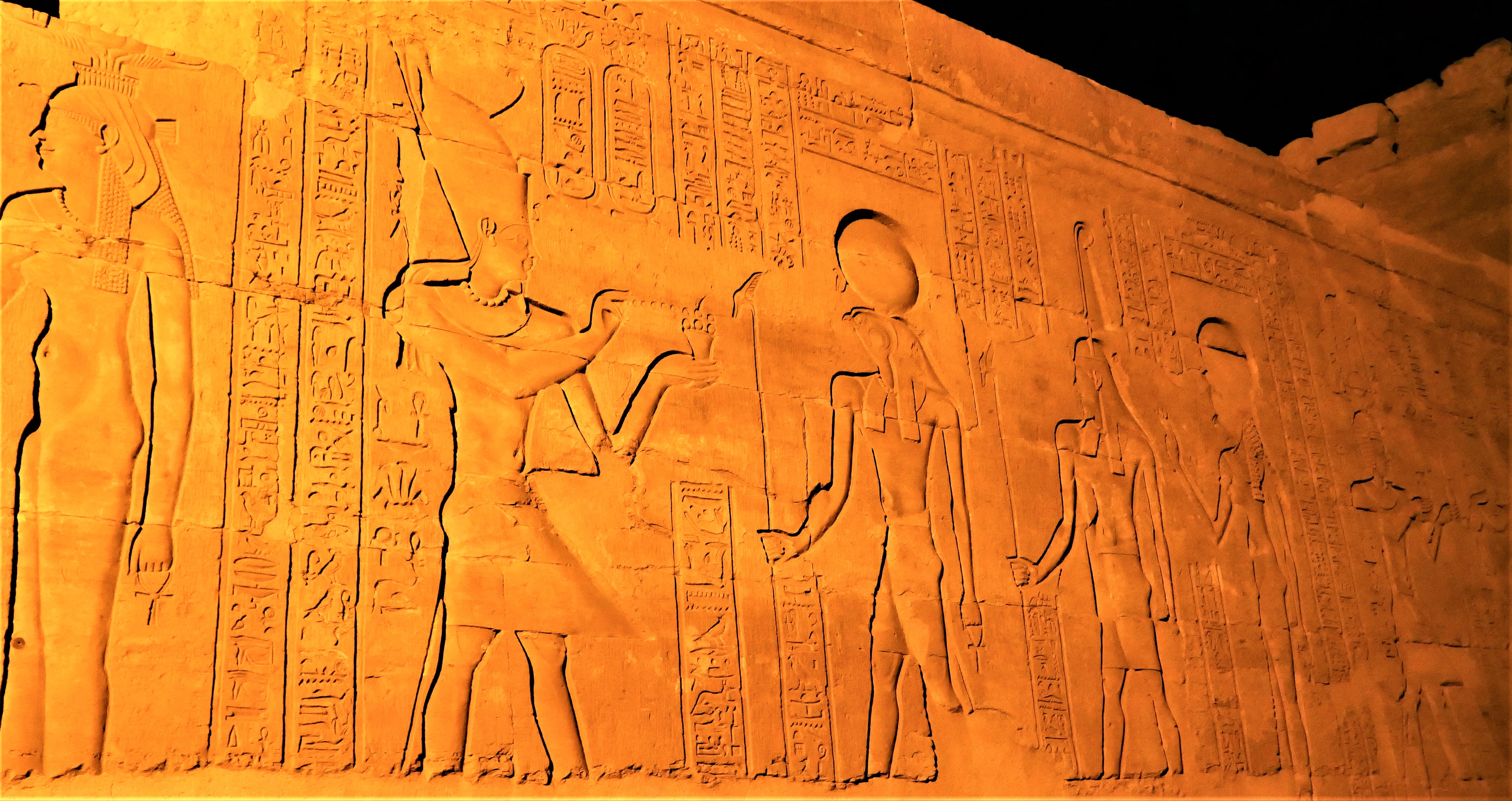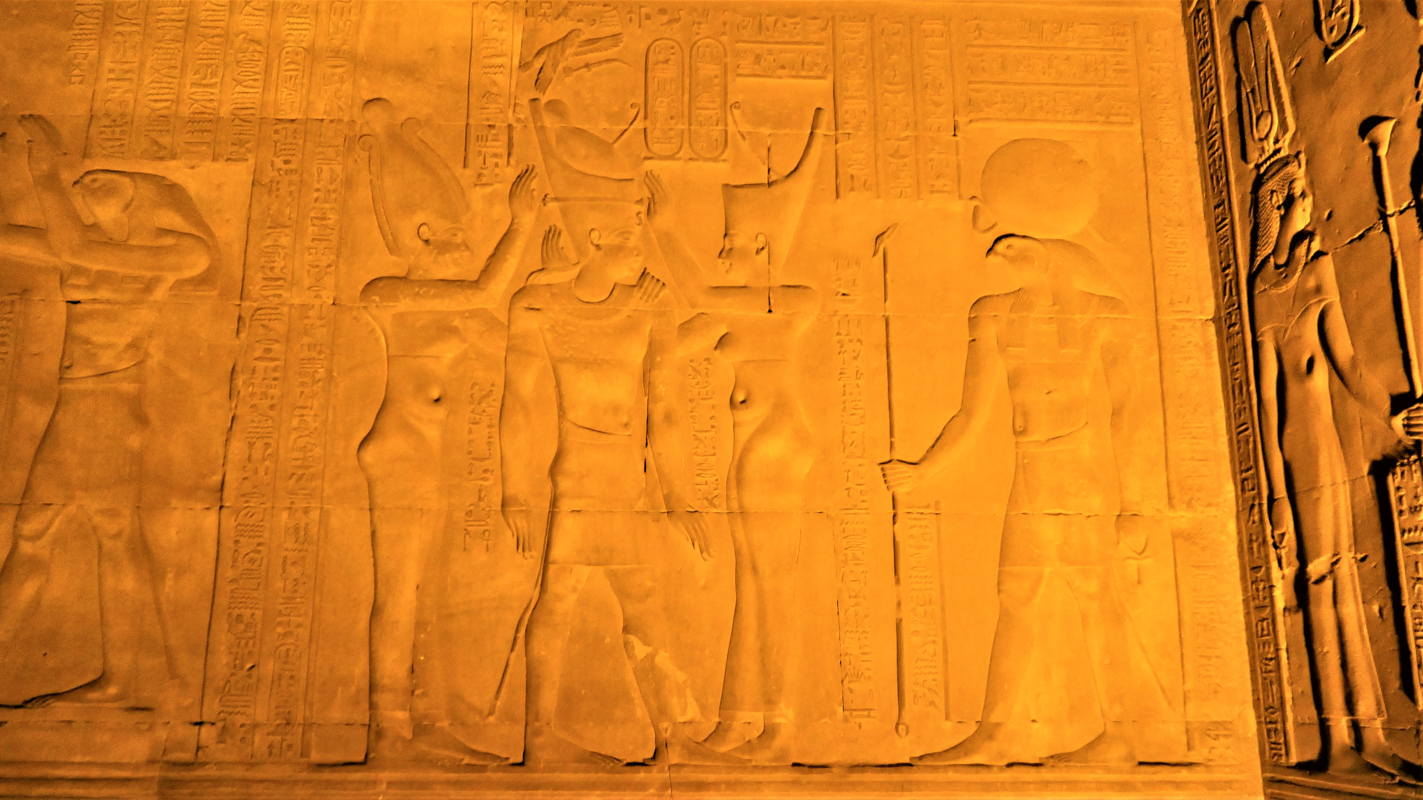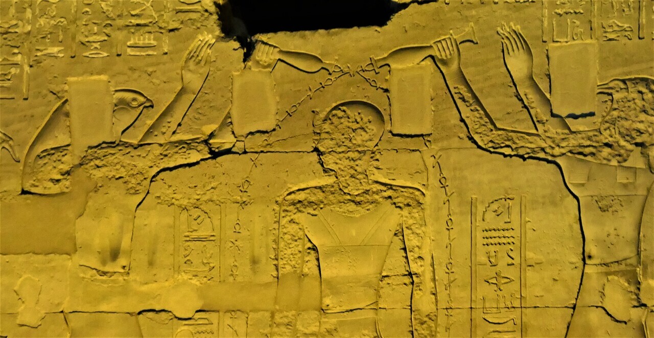 벽에 새긴 부조 대부분은 이 신전을 건축했던 파라오들이 신들에게 공양하고