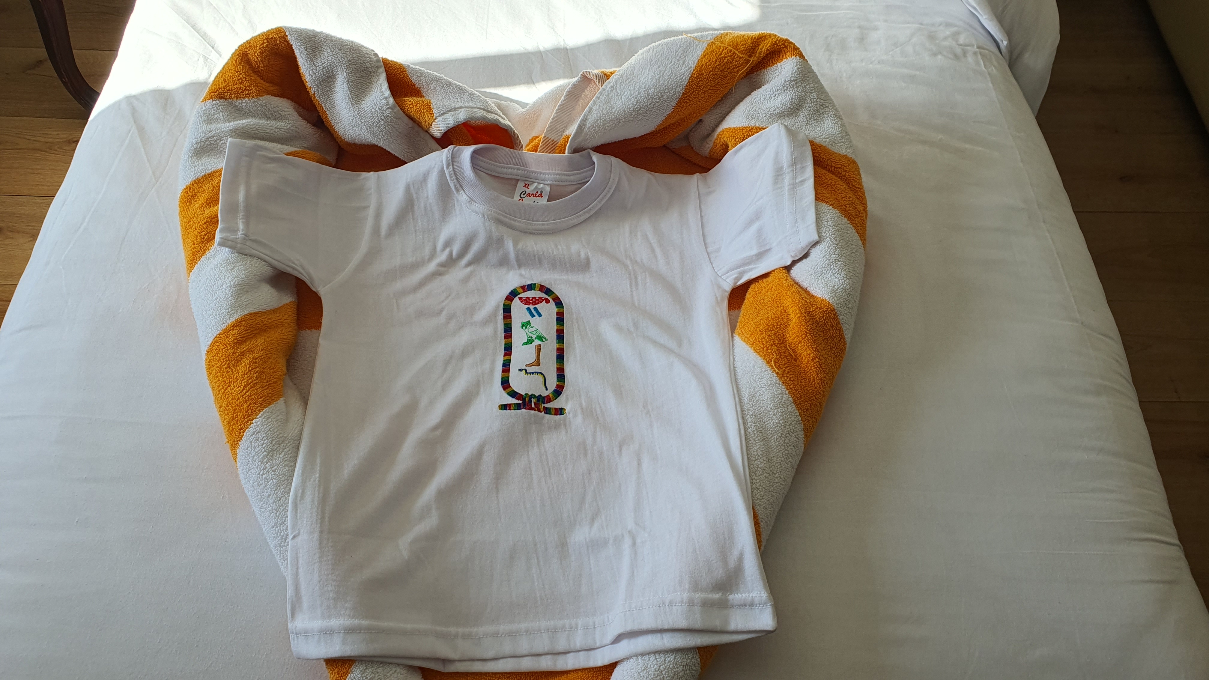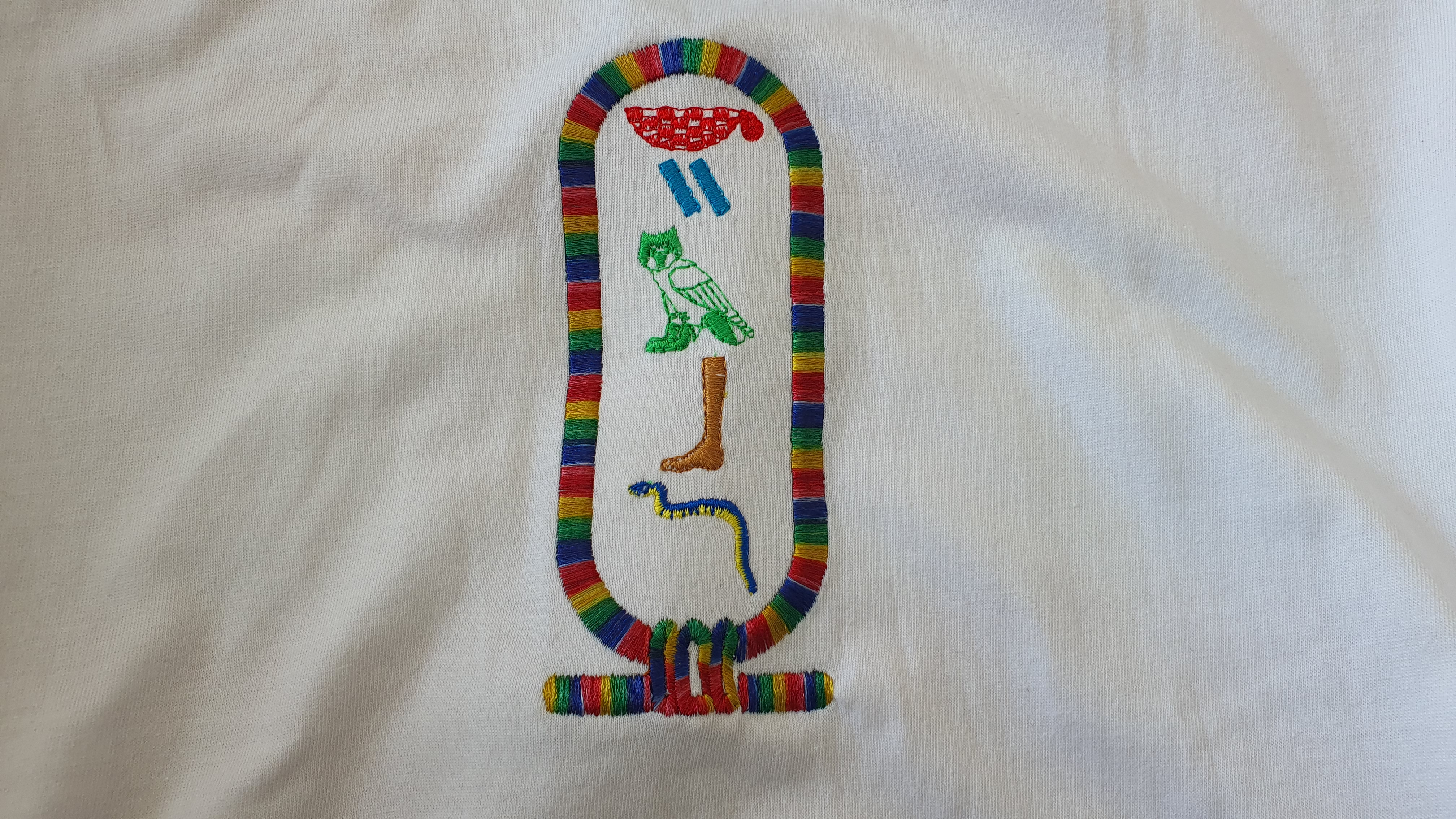 그냥 평범한 T 셔츠지만, 이집트 상형문자인 히에로글리프를 파라오 이름만 적는다는 카르투슈 안에