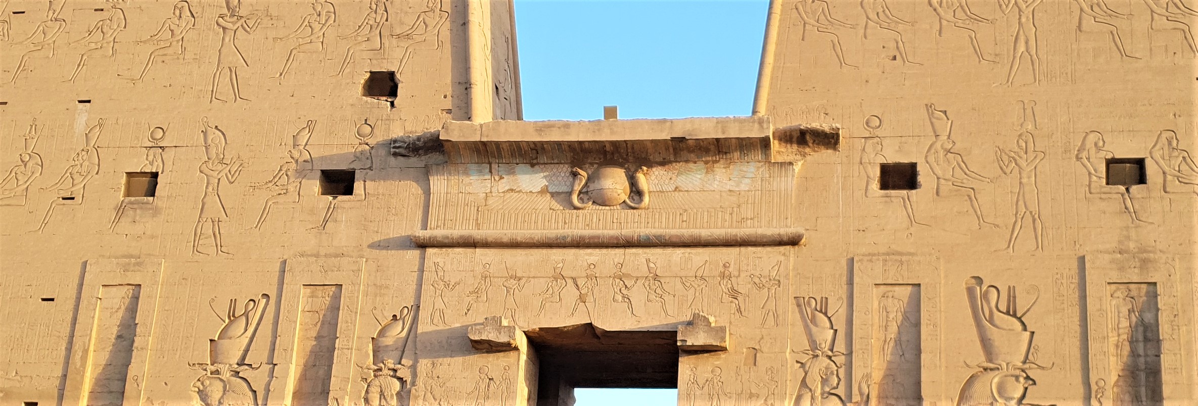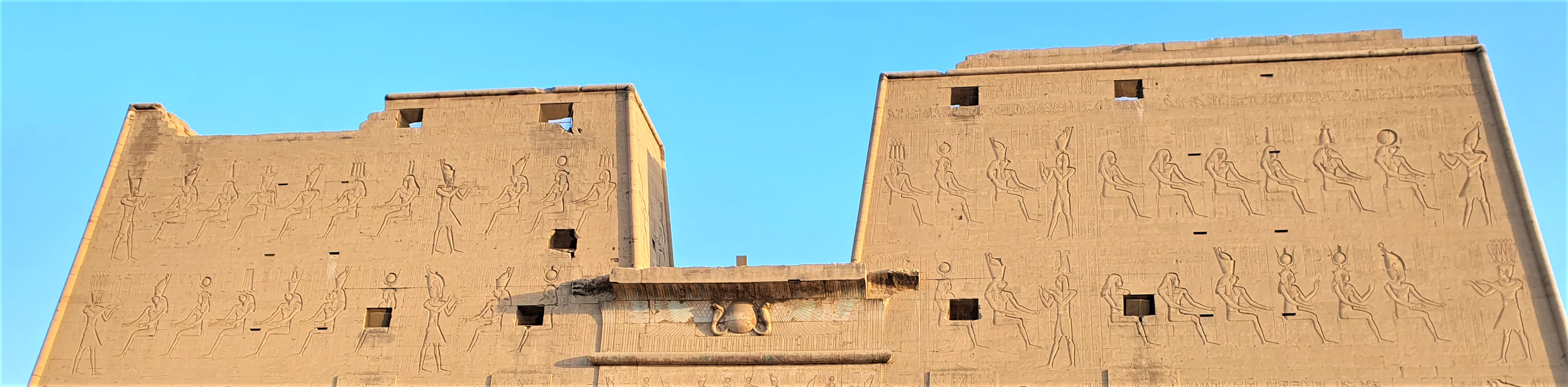 신전 안으로 들어가는 입구가 있고 그 위로는 날개를 활짤 편 둥근 태양과 코브라 두 마리가