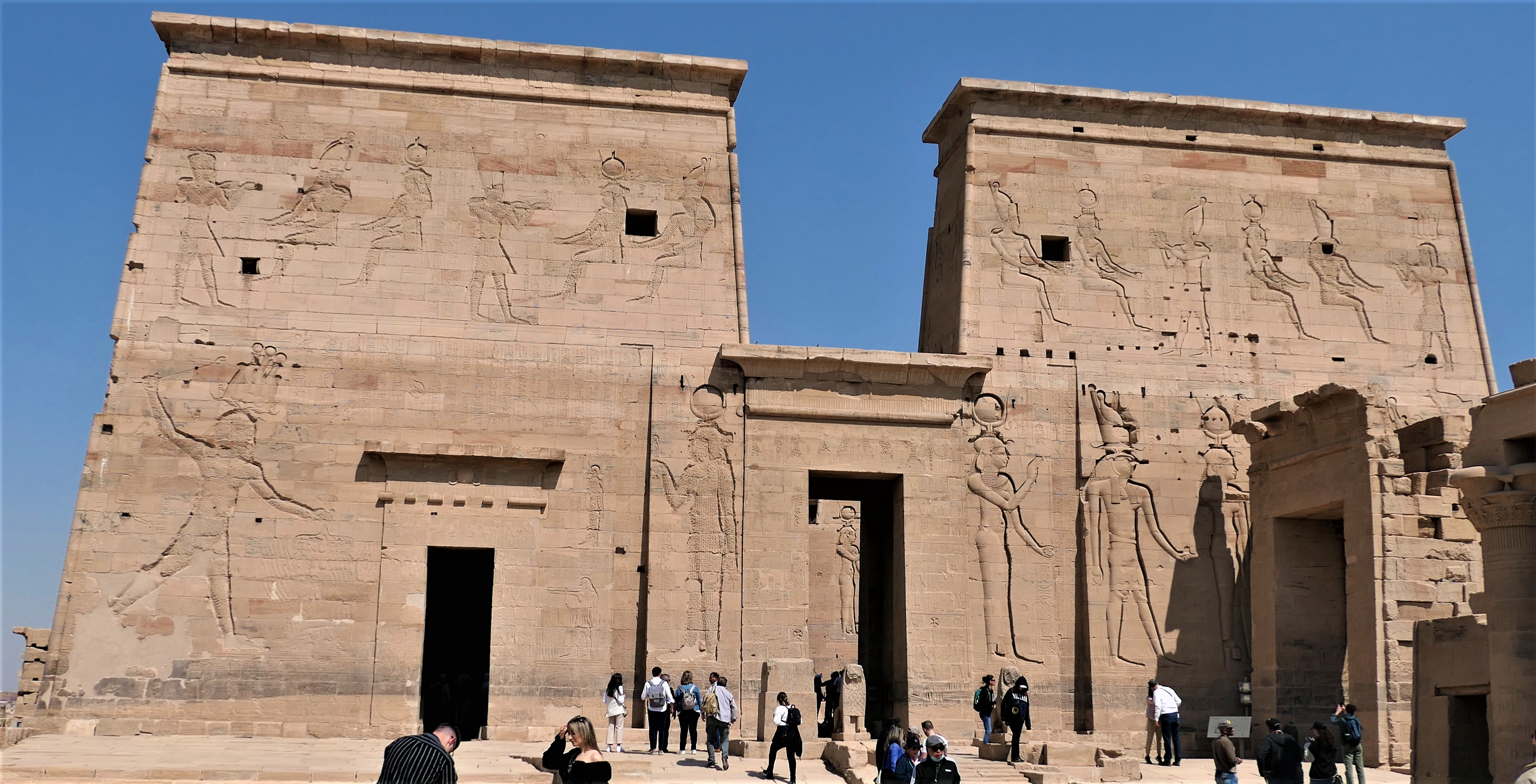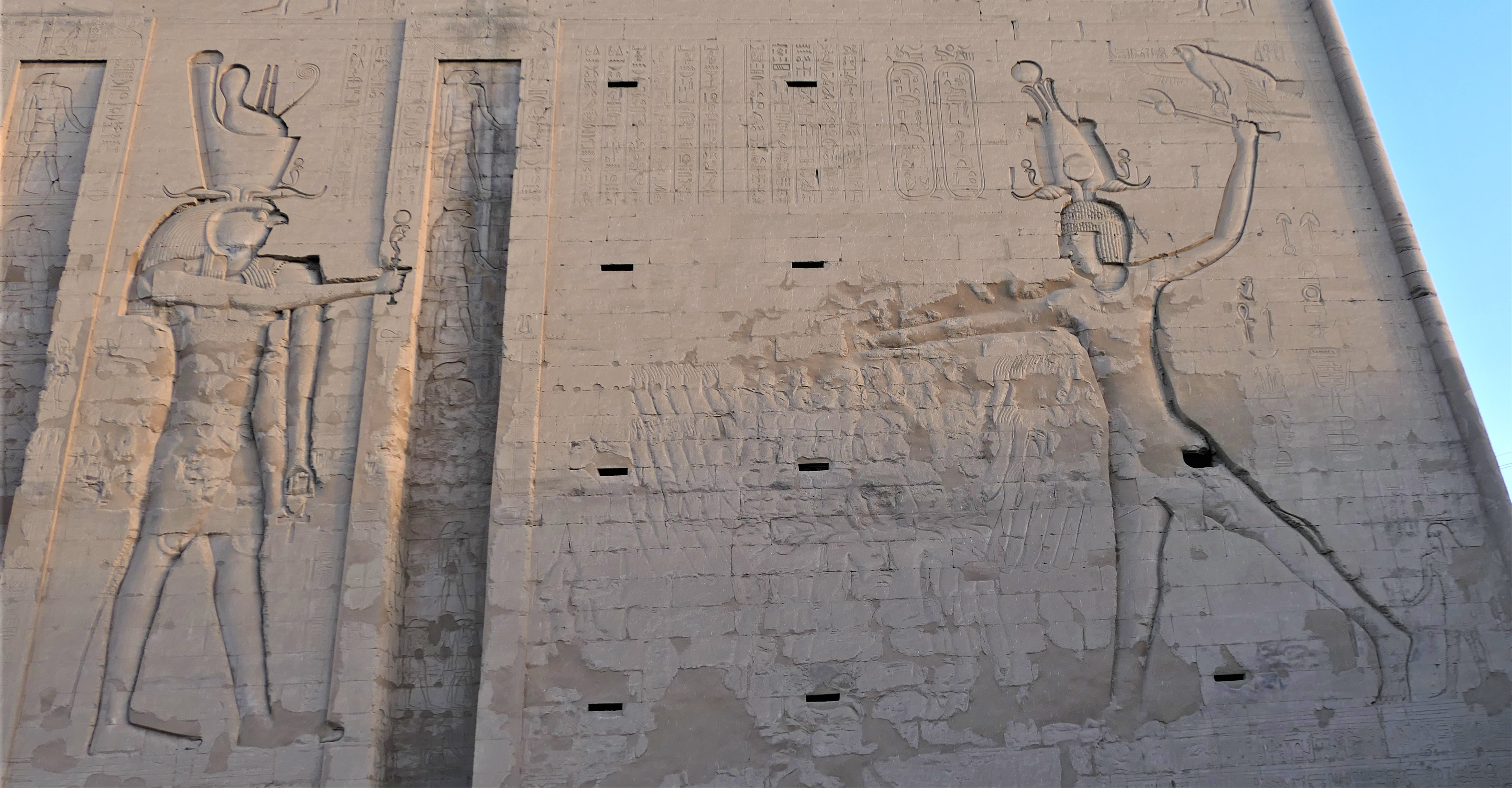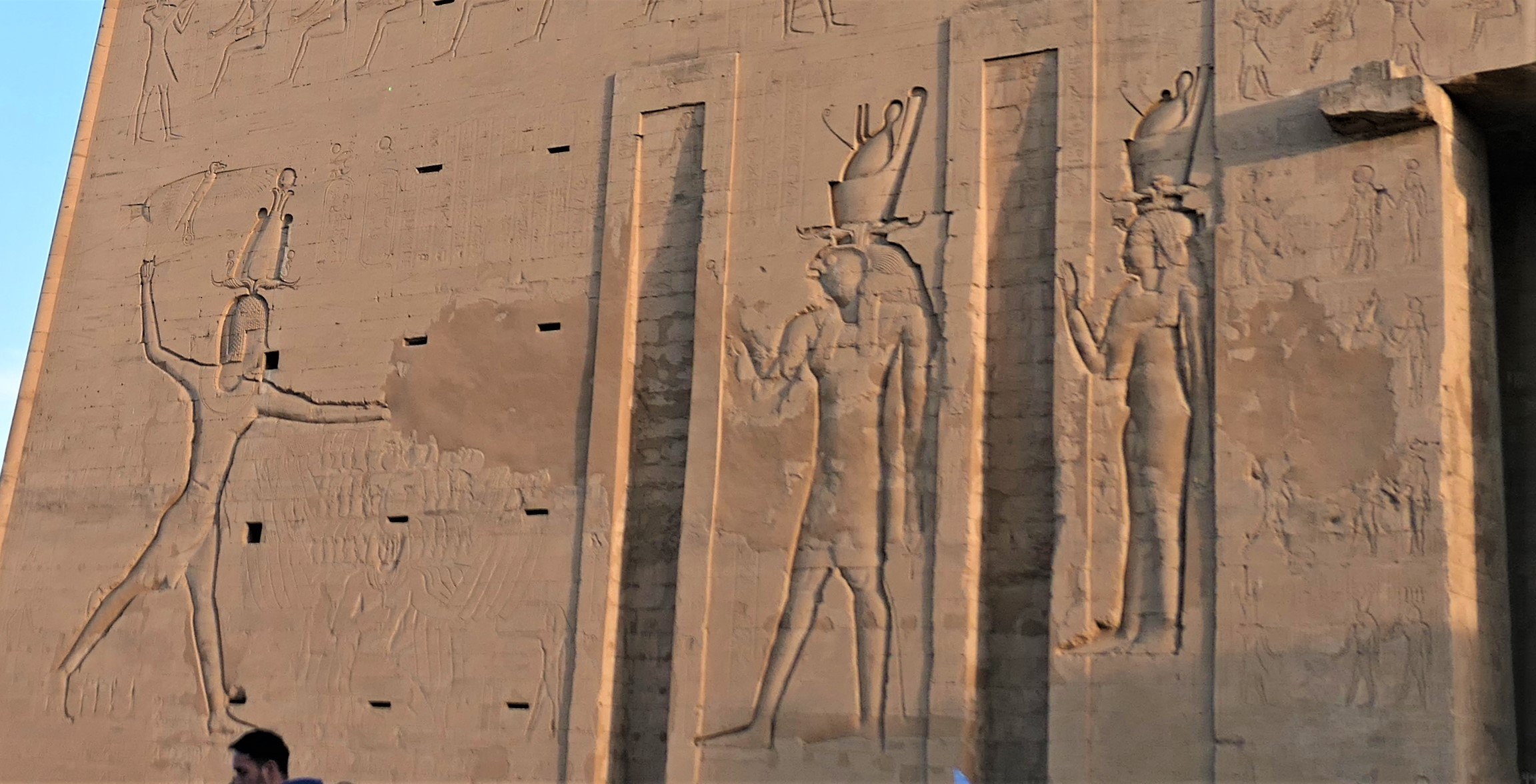 이집트 신전에서 볼 수 있는 전형적인 탑문의 부조로 이미 우리는 필레 신전에서도 보았던 모습으로